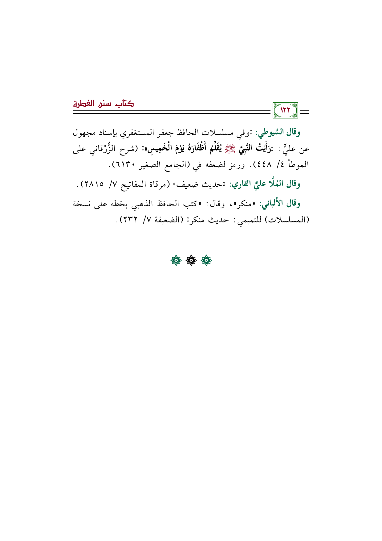 وقال السُّيوطي: "وفي مسلسلات الحافظ جعفر المستغفري بإسناد مجهول عن عليٍّ: ((رَأَيْتُ النَّبِيَّ صَلَّى اللهُ عَلَيْهِ وَسَلَّمَ يُقَلِّمُ أَظْفَارَهُ يَوْمَ الْخَمِيسِ)) " (شرح الزُّرْقاني على الموطأ ٤/ ٤٤٨). ورمز لضعفه في (الجامع الصغير ٦١٣٠).