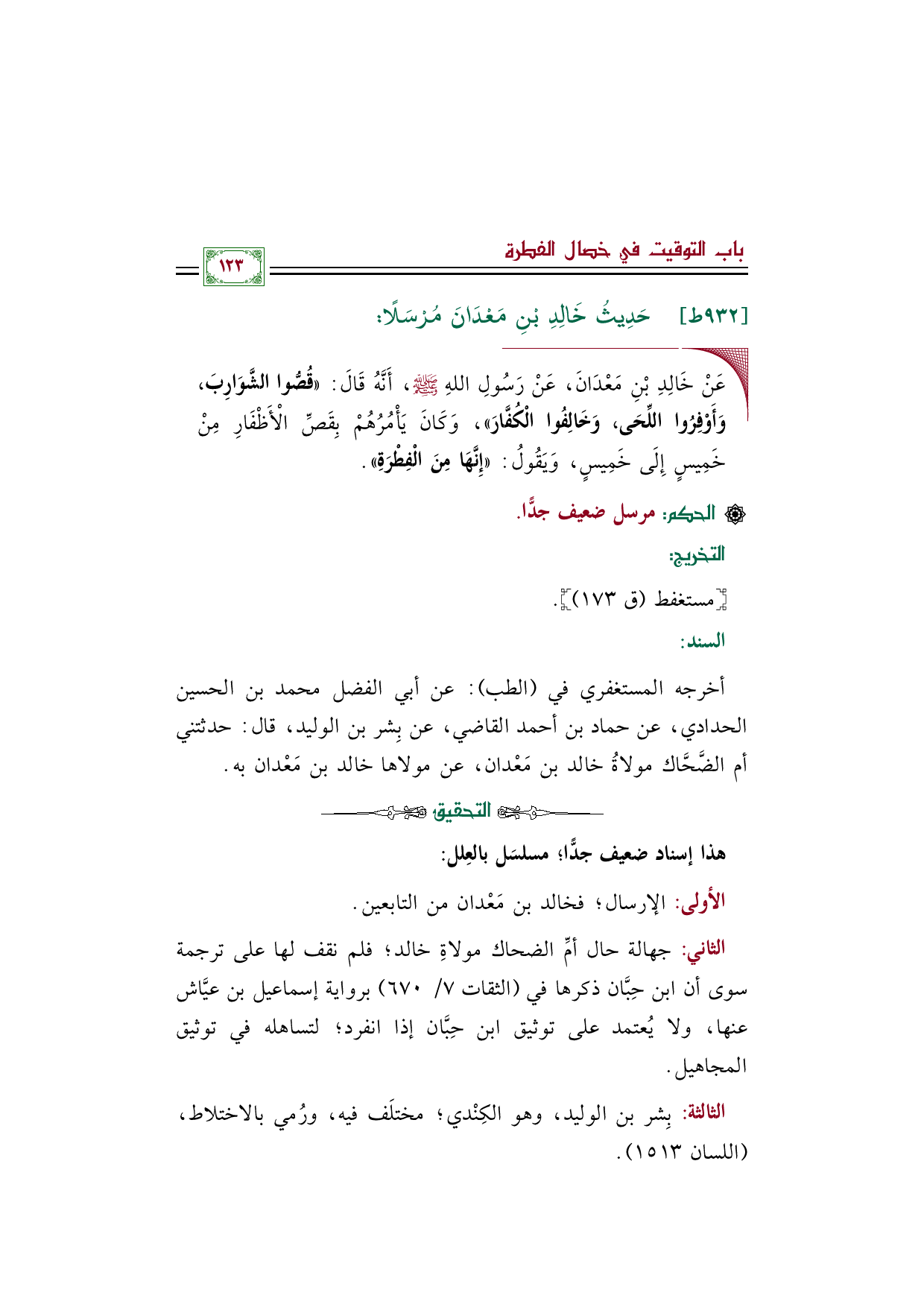 الثاني: جهالة حال أمِّ الضحاك مولاةِ خالد؛ فلم نقف لها على ترجمة سوى أن ابن حِبَّان ذكرها في (الثقات ٧/ ٦٧٠) برواية إسماعيل بن عيَّاش عنها، ولا يُعتمد على توثيق ابن حِبَّان إذا انفرد؛ لتساهله في توثيق المجاهيل.