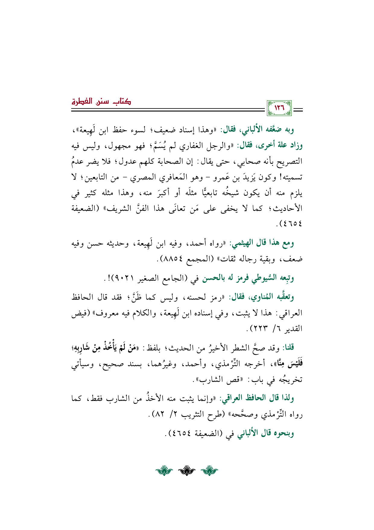 وبه ضعَّفه الألباني، فقال: "وهذا إسناد ضعيف؛ لسوء حفظ ابن لَهِيعة"، وزاد علة أخرى، فقال: "والرجل الغفاري لم يُسَمَّ؛ فهو مجهول، وليس فيه التصريح بأنه صحابي، حتى يقال: إن الصحابة كلهم عدول؛ فلا يضر عدمُ تسميته! وكون يَزيدَ بن عَمرو- وهو المَعافري المصري- من التابعين؛ لا يلزم منه أن يكون شيخُه تابعيًّا مثلَه أو أكبرَ منه، وهذا مثله كثير في الأحاديث؛ كما لا يخفى على مَن تعانَى هذا الفنَّ الشريف" (الضعيفة ٤٦٥٤).