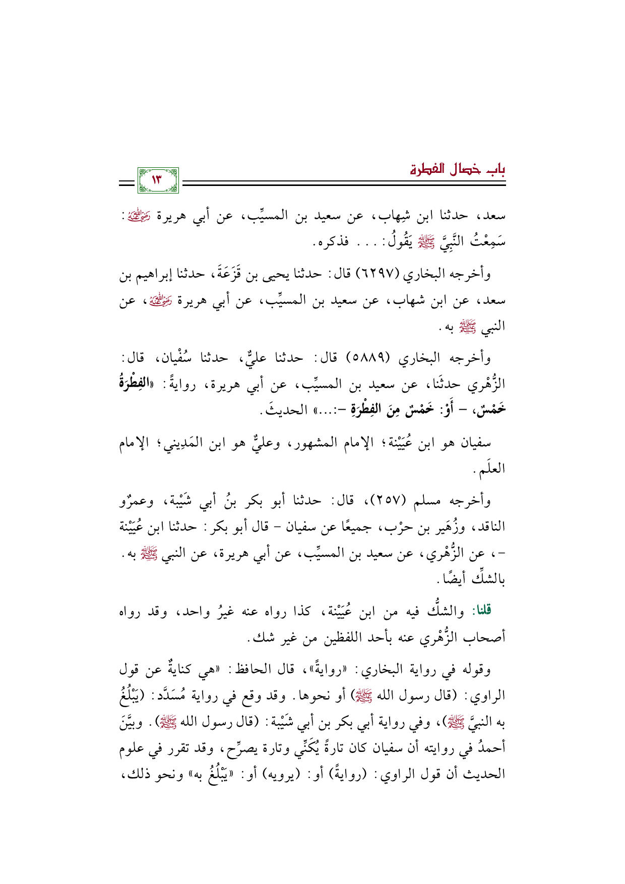 وأخرجه البخاري (٥٨٨٩) قال: حدثنا عليٌّ، حدثنا سُفْيان، قال: الزُّهْري حدثَنا، عن سعيد بن المسيِّب، عن أبي هريرة، روايةً: ((الفِطْرَةُ خَمْسٌ، - أَوْ: خَمْسٌ مِنَ الفِطْرَةِ-: ... )) الحديثَ.