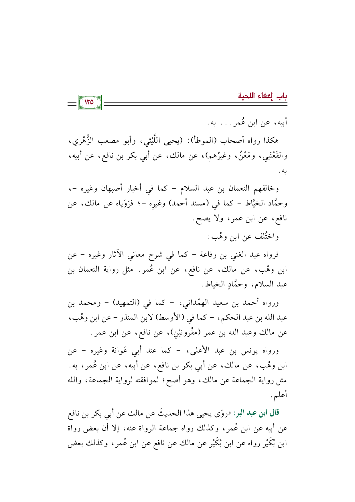 قال ابن عبد البر: " روَى يحيى هذا الحديثَ عن مالك عن أبي بكر بن نافع عن أبيه عن ابن عُمر، وكذلك رواه جماعة الرواة عنه، إلا أن بعض رواة ابن بُكَيْر رواه عن ابن بُكَيْر عن مالك عن نافع عن ابن عُمر، وكذلك بعض
