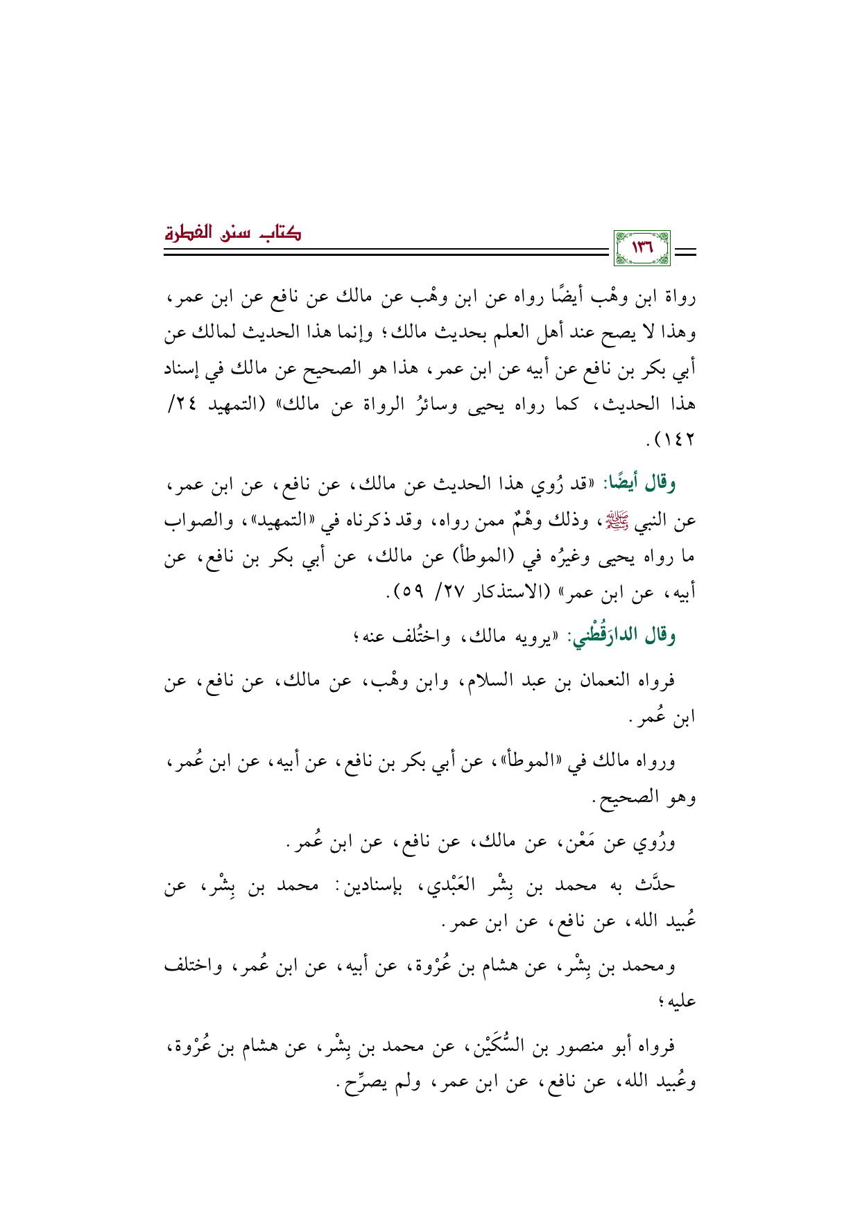 رواة ابن وهْب أيضًا رواه عن ابن وهْب عن مالك عن نافع عن ابن عمر، وهذا لا يصح عند أهل العلم بحديث مالك؛ وإنما هذا الحديث لمالك عن أبي بكر بن نافع عن أبيه عن ابن عمر، هذا هو الصحيح عن مالك في إسناد هذا الحديث، كما رواه يحيى وسائرُ الرواة عن مالك" (التمهيد ٢٤/ ١٤٢).