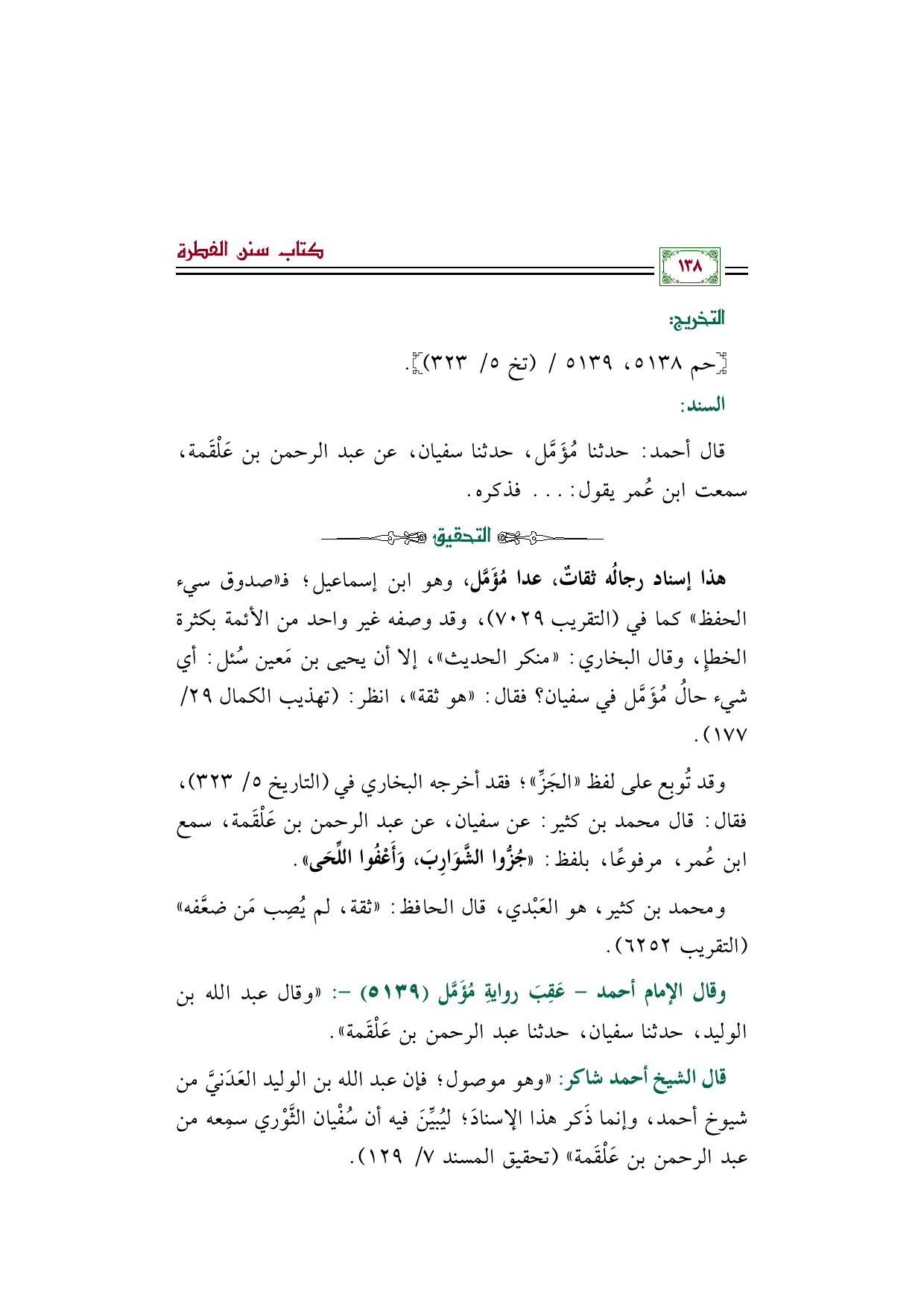 وقال الإمام أحمد- عَقِبَ روايةِ مُؤَمَّل (٥١٣٩) -: "وقال عبد الله بن الوليد، حدثنا سفيان، حدثنا عبد الرحمن بن عَلْقَمة".