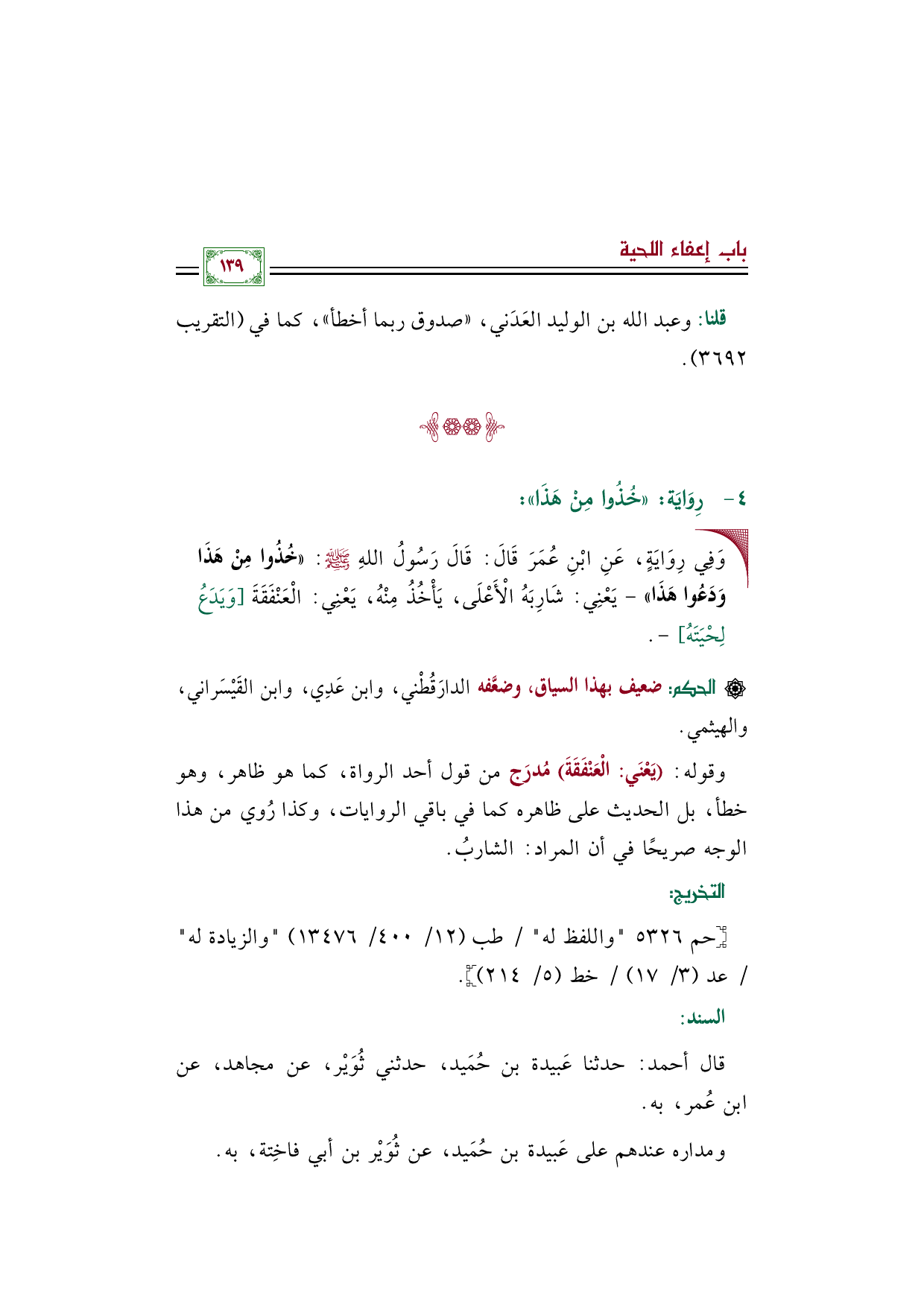وقوله: (يَعْنَي: الْعَنْفَقَةَ) مُدرَج من قول أحد الرواة، كما هو ظاهر، وهو خطأ، بل الحديث على ظاهره كما في باقي الروايات، وكذا رُوي من هذا الوجه صريحًا في أن المراد: الشاربُ.