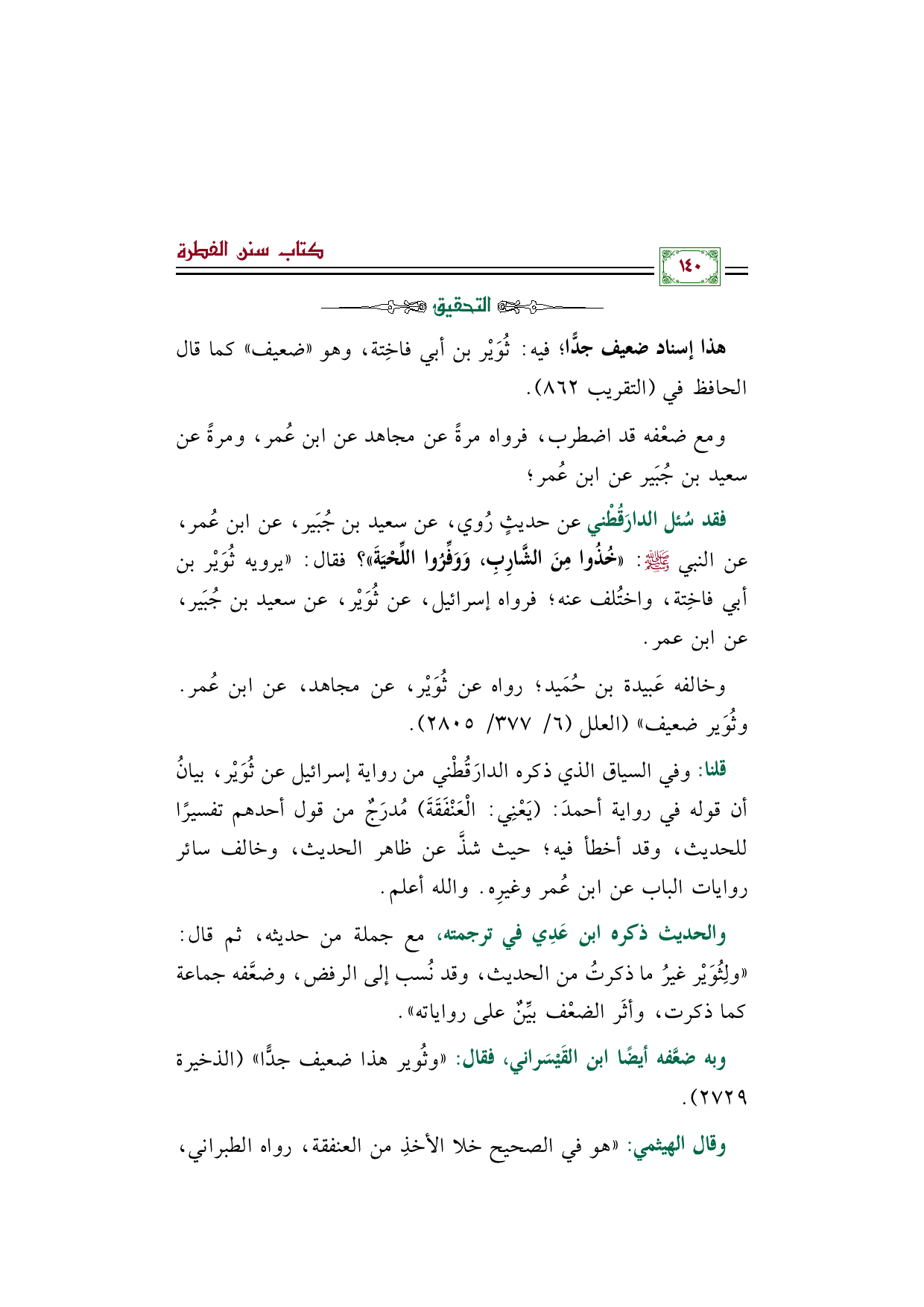 قلنا: وفي السياق الذي ذكره الدارَقُطْني من رواية إسرائيل عن ثُوَيْر، بيانُ أن قوله في رواية أحمدَ: (يَعْنِي: الْعَنْفَقَةَ) مُدرَجٌ من قول أحدهم تفسيرًا للحديث، وقد أخطأ فيه؛ حيث شذَّ عن ظاهر الحديث، وخالف سائر روايات الباب عن ابن عُمر وغيرِه. والله أعلم.