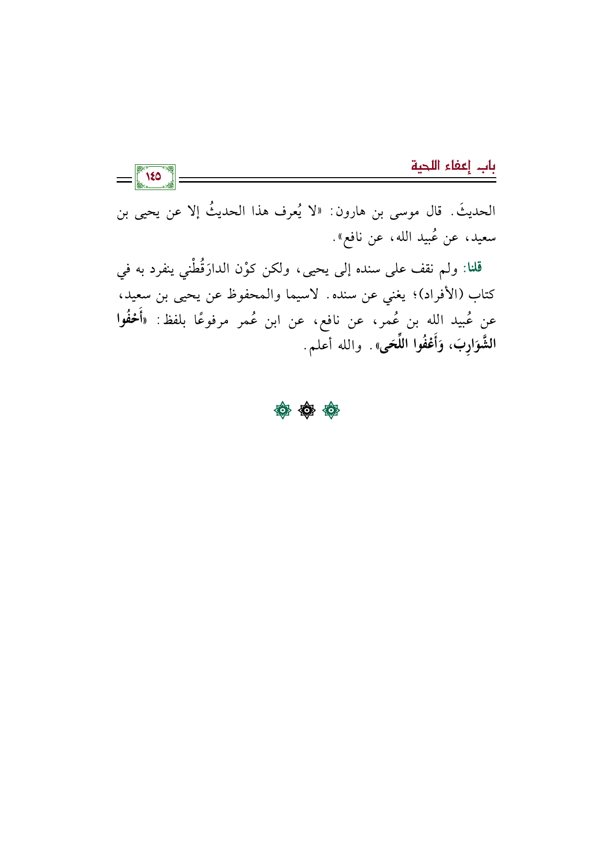 قلنا: ولم نقف على سنده إلى يحيى، ولكن كوْن الدارَقُطْني ينفرد به في كتاب (الأفراد)؛ يغني عن سنده. لاسيما والمحفوظ عن يحيى بن سعيد، عن عُبيد الله بن عُمر، عن نافع، عن ابن عُمر مرفوعًا بلفظ: ((أَحْفُوا الشَّوَارِبَ، وَأَعْفُوا اللِّحَى)). والله أعلم.