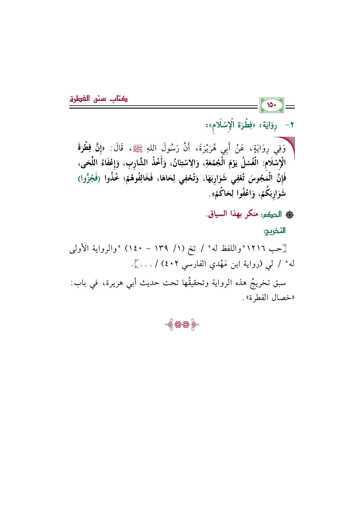 • وَفِي رِوَايَةٍ، عَنْ أَبِي هُرَيْرَةَ، أَنَّ رَسُولَ اللهِ صَلَّى اللهُ عَلَيْهِ وَسَلَّمَ، قَالَ: ((إِنَّ فِطْرَةَ الْإِسْلَامِ: الْغُسْلُ يَوْمَ الْجُمُعَةِ، وَالِاسْتِنَانُ، وَأَخْذُ الشَّارِبِ، وَإِعْفَاءُ اللِّحَى، فَإِنَّ الْمَجُوسَ تُعْفِي شَوَارِبَهَا، وَتُحْفِي لِحَاهَا، فَخَالِفُوهُمْ؛ خُذُوا (فَجُزُّوا) شَوَارِبَكُمْ، وَاعْفُوا لِحَاكُمْ)).