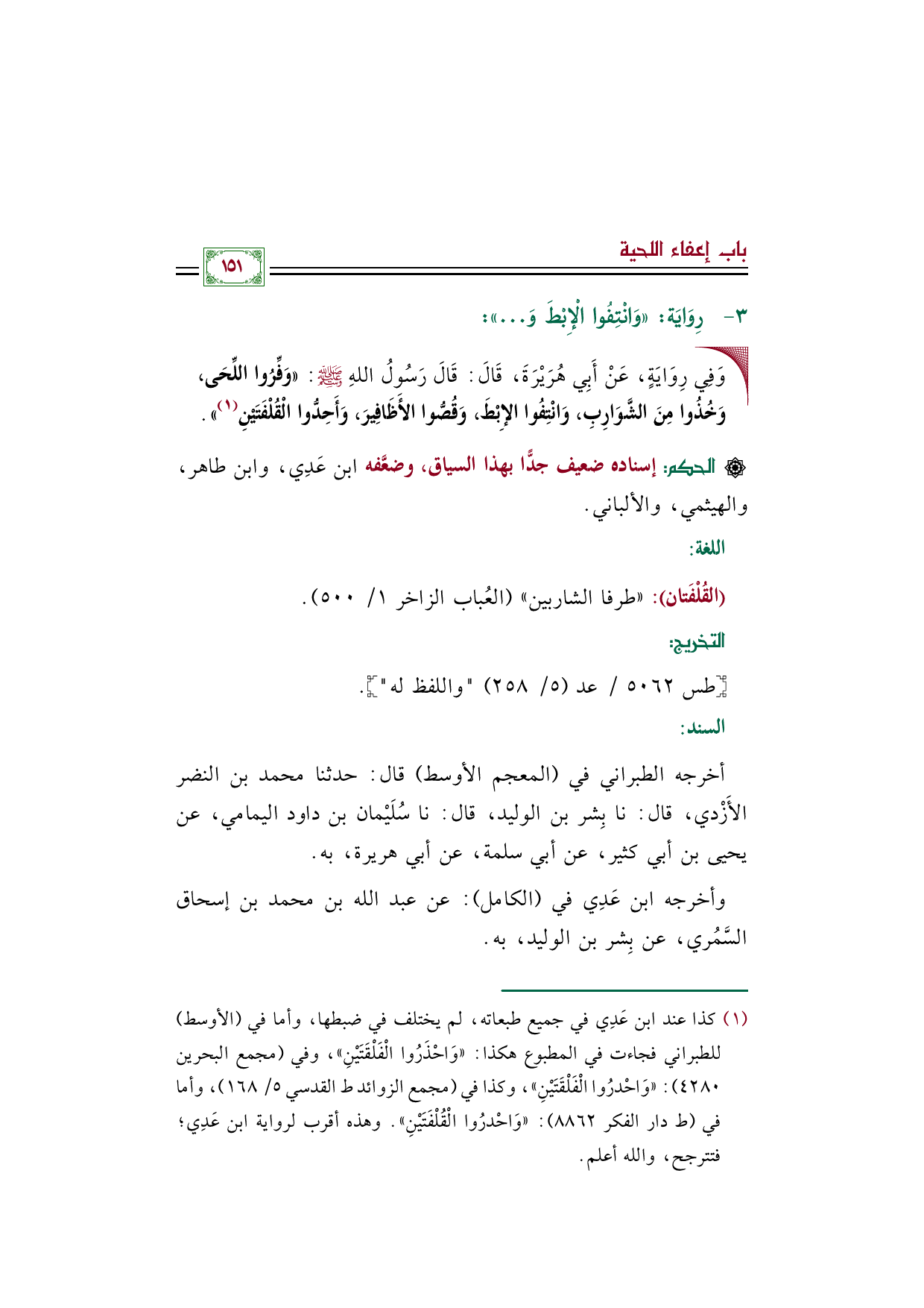 (¬١) كذا عند ابن عَدِي في جميع طبعاته، لم يختلف في ضبطها، وأما في الأوسط للطبراني فجاءت في المطبوع هكذا: "وَاحْذَرُوا الْفَلْقَتَيْنِ"، وفي (مجمع البحرين ٤٢٨٠): "وَاحْدرُوا الْفَلْقَتَيْنِ"، وكذا في (مجمع الزوائد ط القدسي ٥/ ١٦٨)، وأما في (ط دار الفكر ٨٨٦٢): "وَاحْدرُوا الْقُلْفَتَيْنِ". وهذه أقرب لرواية ابن عَدِي؛ فتترجح، والله أعلم.