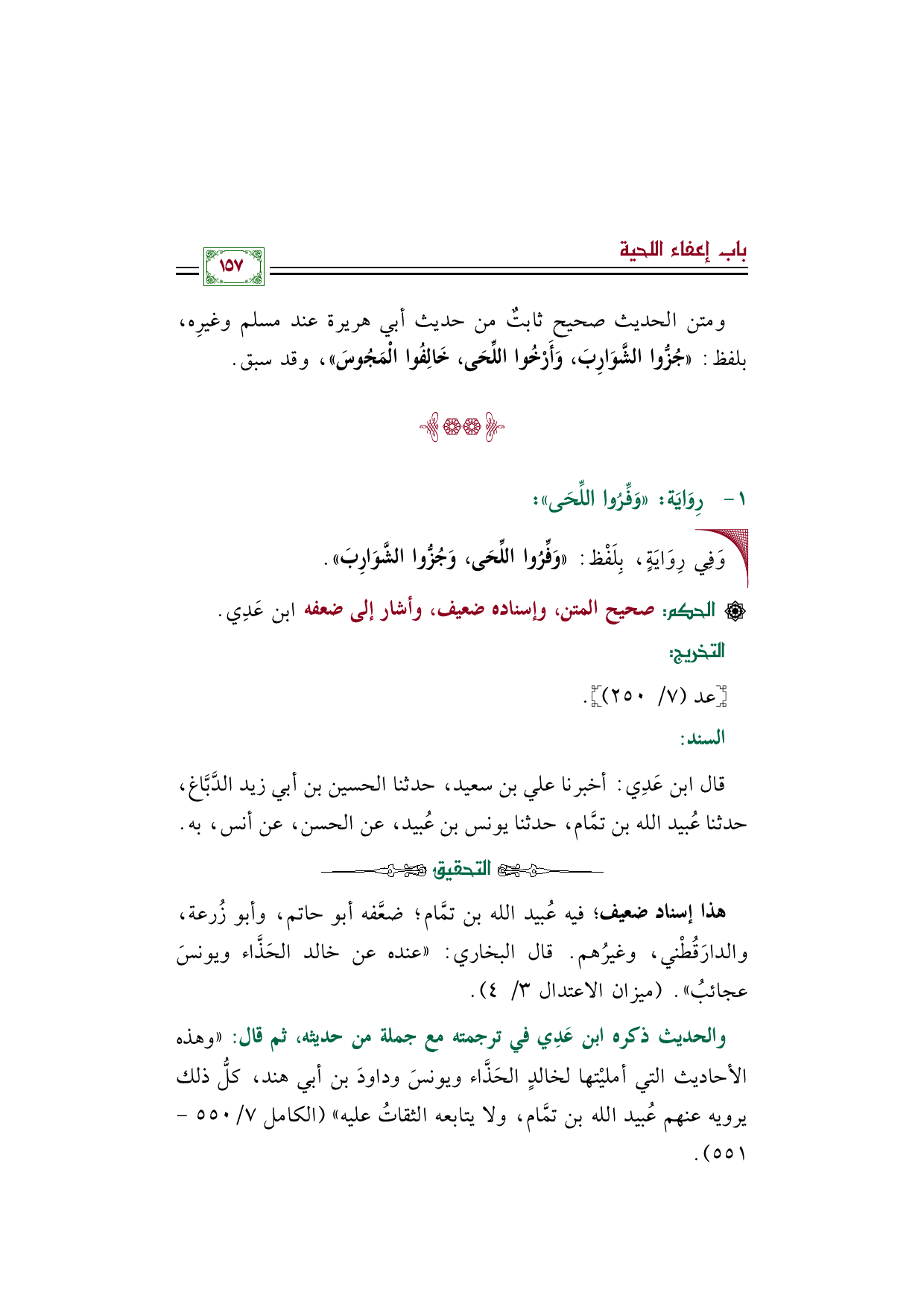 [الحكم]: صحيح المتن، وإسناده ضعيف، وأشار إلى ضعفه ابن عَدِي.