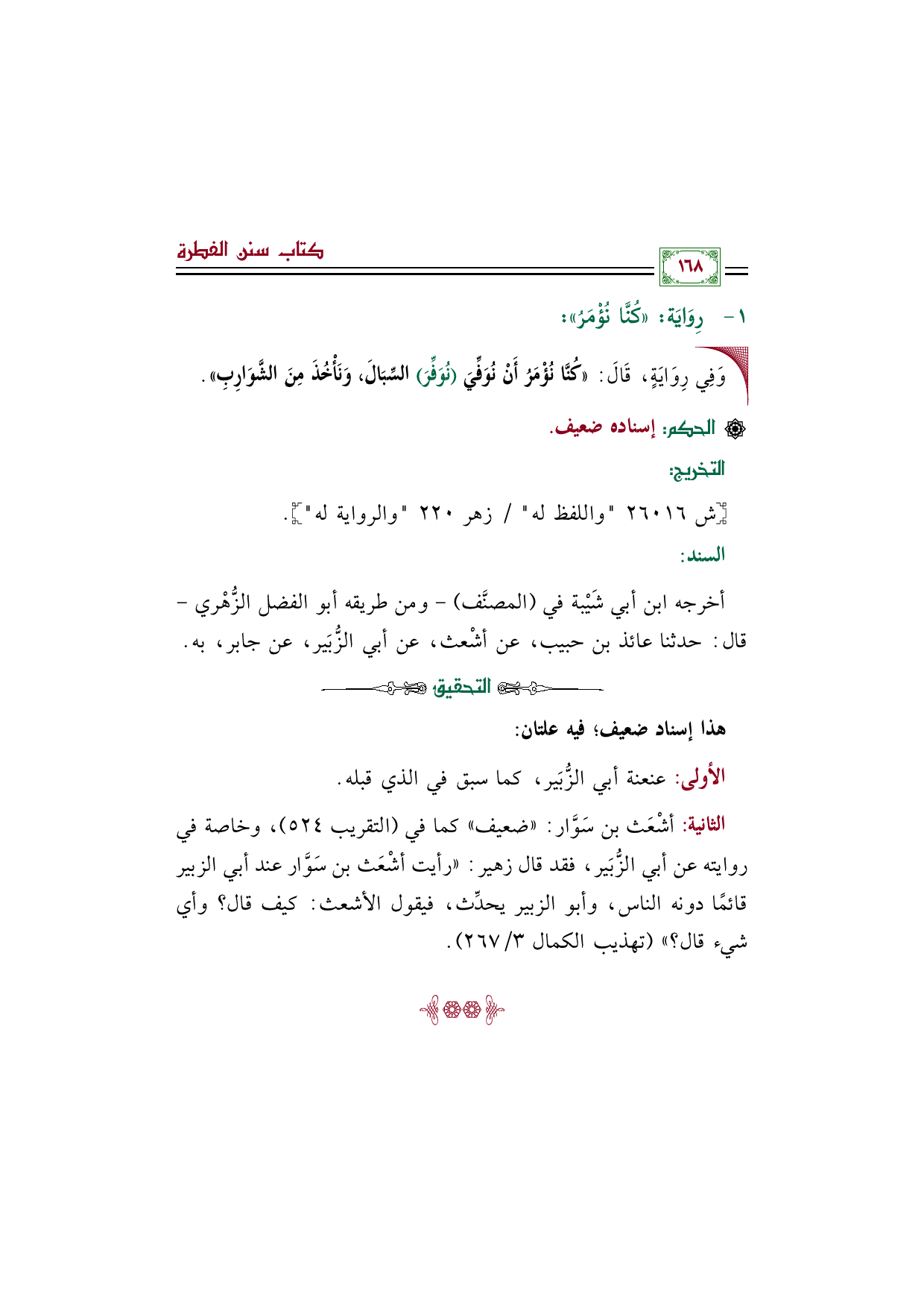 الثانية: أشْعَث بن سَوَّار: "ضعيف" كما في (التقريب ٥٢٤)، وخاصة في روايته عن أبي الزُّبَير، فقد قال زهير: "رأيت أشْعَث بن سَوَّار عند أبي الزبير قائمًا دونه الناس، وأبو الزبير يحدِّث، فيقول الأشعث: كيف قال؟ وأي شيء قال؟ " (تهذيب الكمال ٣/ ٢٦٧).