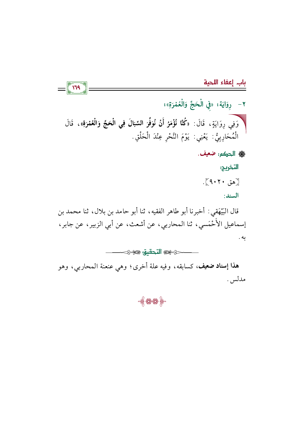 • وَفِي رِوَايَةٍ، قَالَ: ((كُنَّا نُؤْمَرُ أَنْ نُوَفِّرَ السِّبَالَ فِي الْحَجِّ وَالْعُمْرَةِ))، قَالَ الْمُحَارِبِيُّ: يَعْنِي: يَوْمَ النَّحْرِ عِنْدَ الْحَلْقِ.