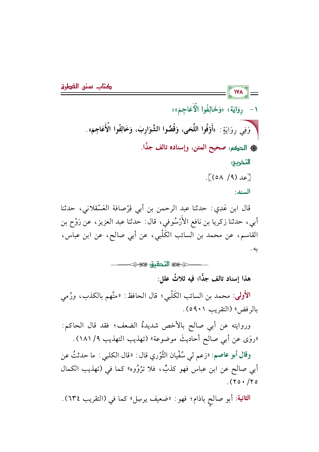 الأولى: محمد بن السائب الكَلْبي؛ قال الحافظ: "متَّهم بالكذب، ورُمي بالرفض" (التقريب ٥٩٠١).