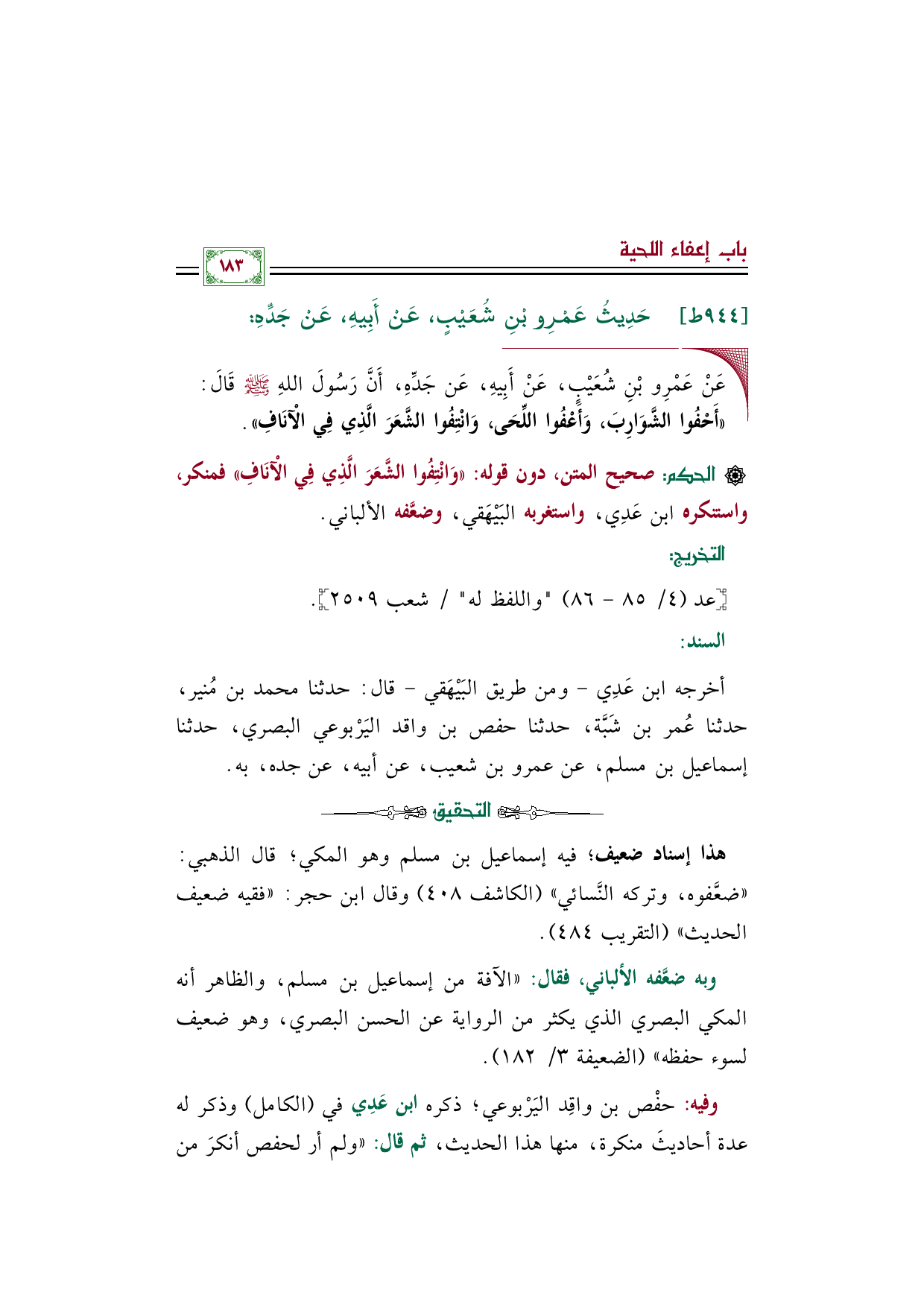 أخرجه ابن عَدِي- ومن طريق البَيْهَقي- قال: حدثنا محمد بن مُنير، حدثنا عُمر بن شَبَّة، حدثنا حفص بن واقد اليَرْبوعي البصري، حدثنا إسماعيل بن مسلم، عن عمرو بن شعيب، عن أبيه، عن جده، به.