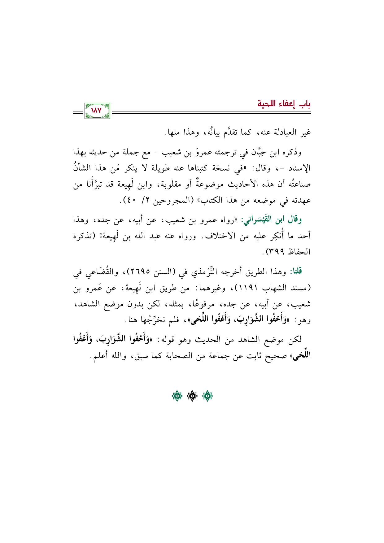 قلنا: وهذا الطريق أخرجه التِّرْمذي في (السنن ٢٦٩٥)، والقُضَاعي في (مسند الشهاب ١١٩١)، وغيرهما: من طريق ابن لَهِيعة، عن عَمرو بن شعيب، عن أبيه، عن جده، مرفوعًا، بمثله، لكن بدون موضع الشاهد، وهو: (وَأَحْفُوا الشَّوَارِبَ، وَأَعْفُوا اللِّحَى)، فلم نخرِّجْها هنا.