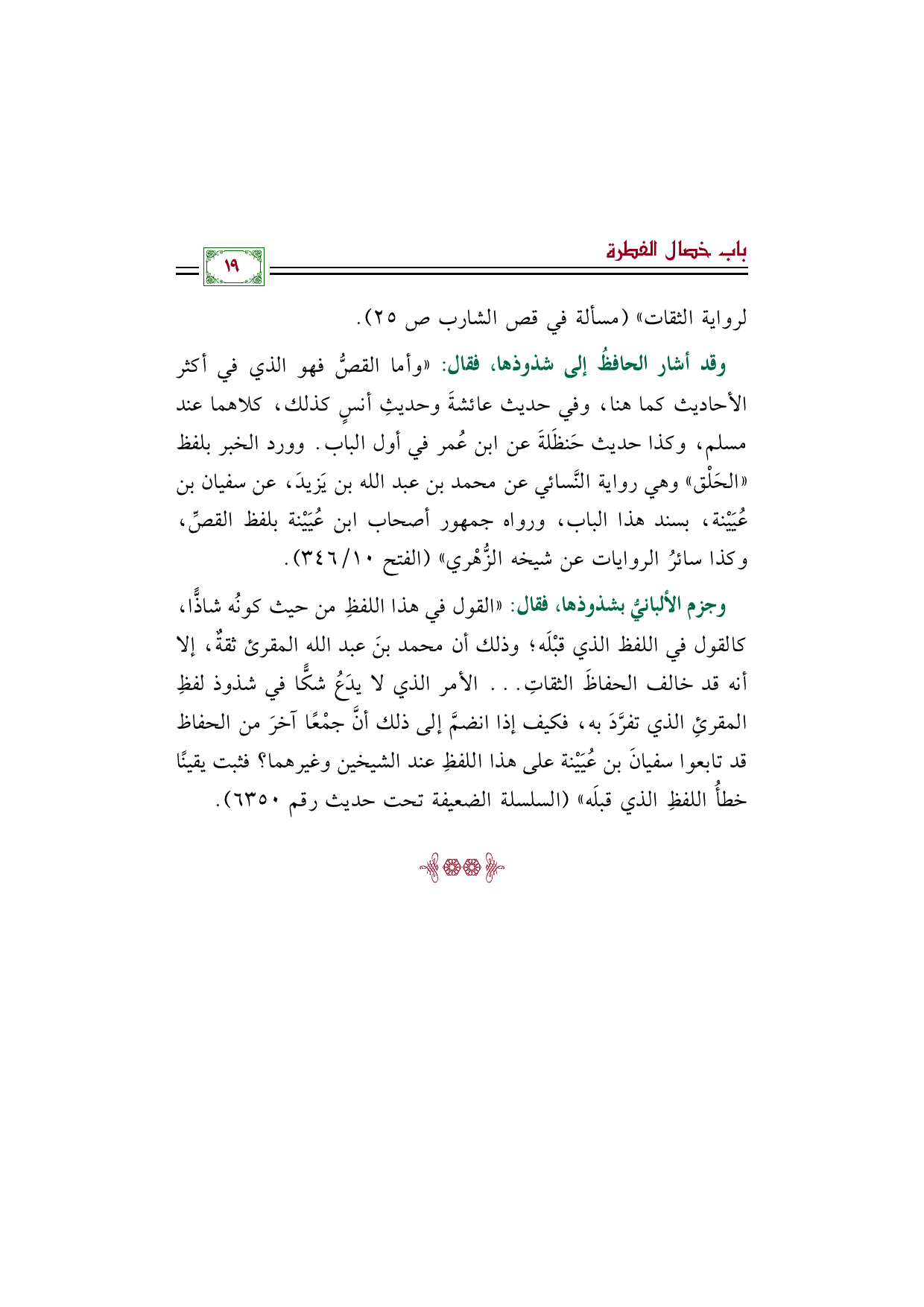 وقد أشار الحافظُ إلى شذوذها، فقال: "وأما القصُّ فهو الذي في أكثر الأحاديث كما هنا، وفي حديث عائشةَ وحديثِ أنسٍ كذلك، كلاهما عند مسلم، وكذا حديث حَنظَلةَ عن ابن عُمر في أول الباب. وورد الخبر بلفظ (الحَلْق) وهي رواية النَّسائي عن محمد بن عبد الله بن يَزيدَ، عن سفيان بن عُيَيْنة، بسند هذا الباب، ورواه جمهور أصحاب ابن عُيَيْنة بلفظ القصِّ، وكذا سائرُ الروايات عن شيخه الزُّهْري" (الفتح ١٠/ ٣٤٦).