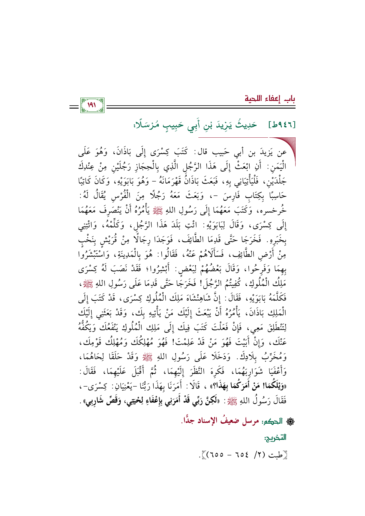 ◼ عن يَزيدَ بن أبي حَبيب قال: كَتَبَ كِسْرَى إِلَى بَاذَانَ، وَهُوَ عَلَى الْيَمَنِ: أَنِ ابْعَثْ إِلَى هَذَا الرَّجُلِ الَّذِي بِالْحِجَازِ رَجُلَيْنِ مِنْ عِنْدِكَ جَلْدَيْنِ، فَلْيَأْتِيَانِي بِهِ، فَبَعَثَ بَاذَانُ قَهْرَمَانَهُ- وَهُوَ بَابَوَيْهِ، وَكَانَ كَاتِبًا حَاسِبًا بِكِتَابِ فَارِسَ-، وَبَعَثَ مَعَهُ رَجُلًا مِنَ الْفُرْسِ يُقَالُ لَهُ: خُرخسره، وَكَتَبَ مَعَهُمَا إِلَى رَسُولِ اللهِ صَلَّى اللهُ عَلَيْهِ وَسَلَّمَ يَأْمُرُهُ أَنْ يَنْصَرِفَ مَعَهُمَا إِلَى كِسْرَى، وَقَالَ لِبَابَوَيْهِ: ائْتِ بَلَدَ هَذَا الرَّجُلِ، وَكَلِّمْهُ، وَائْتِنِي بِخَبَرِهِ. فَخَرَجَا حَتَّى قَدِمَا الطَّائِفَ، فَوَجَدَا رِجَالًا مِنْ قُرَيْشٍ بِنَخْبٍ مِنْ أَرْضِ الطَّائِفِ، فَسَأَلَاهُمْ عَنْهُ، فَقَالُوا: هُوَ بِالْمَدِينَةِ، وَاسْتَبْشَرُوا بِهِمَا وَفَرِحُوا، وَقَالَ بَعْضُهُمْ لِبَعْضٍ: أَبْشِرُوا؛ فَقَدْ نَصَبَ لَهُ كِسْرَى مَلِكُ الْمُلُوكِ، كُفِيتُمُ الرَّجُلَ! فَخَرَجَا حَتَّى قَدِمَا عَلَى رَسُولِ اللهِ صَلَّى اللهُ عَلَيْهِ وَسَلَّمَ، فَكَلَّمَهُ بَابَوَيْهِ، فَقَالَ: إِنَّ شَاهِنْشَاهَ مَلِكَ الْمُلُوكِ كِسْرَى، قَدْ كَتَبَ إِلَى الْمَلِكِ بَاذَانَ، يَأْمُرُهُ أَنْ يَبْعَثَ إِلَيْكَ مَنْ يَأْتِيهِ بِكَ، وَقَدْ بَعَثَنِي إِلَيْكَ لِتَنْطَلِقَ مَعِي، فَإِنْ فَعَلْتَ كَتَبَ فِيكَ إِلَى مَلِكِ الْمُلُوكِ يَنْفَعُكَ وَيَكُفُّهُ عَنْكَ، وَإِنْ أَبَيْتَ فَهُوَ مَنْ قَدْ عَلِمْتَ! فَهُوَ مُهْلِكُكَ وَمُهْلِكُ قَوْمِكَ، وَمُخَرِّبُ بِلَادِكَ.