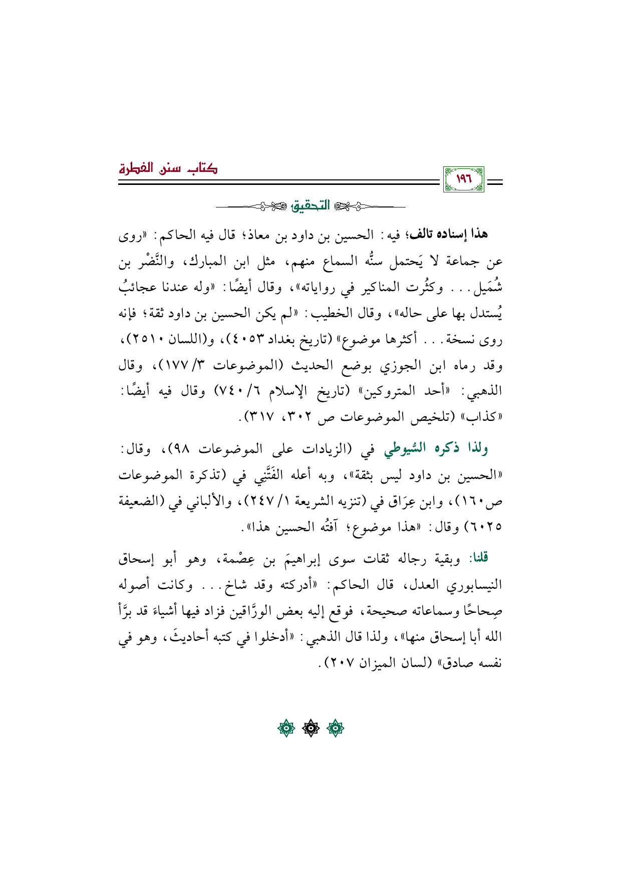 ولذا ذكره السُّيوطي في (الزيادات على الموضوعات ٩٨)، وقال: "الحسين بن داود ليس بثقة"، وبه أعله الفَتَّنِي في (تذكرة الموضوعات ص ١٦٠)، وابن عِرَاق في (تنزيه الشريعة ١/ ٢٤٧)، والألباني في (الضعيفة ٦٠٢٥) وقال: "هذا موضوع؛ آفتُه الحسين هذا".