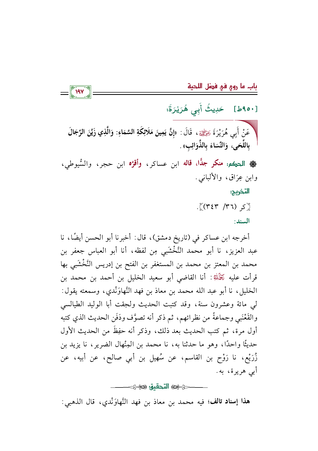 أخرجه ابن عساكر في (تاريخ دمشق)، قال: أخبرنا أبو الحسن أيضًا، نا عبد العزيز، نا أبو محمد النَّخْشَبي مِن لفظه، أنا أبو العباس جعفر بن محمد بن المعتز بن محمد بن المستغفر بن الفتح بن إدريس النَّخْشَبي بها قرأت عليه رحمه الله: أنا القاضي أبو سعيد الخليل بن أحمد بن محمد بن الخليل، نا أبو عبد الله محمد بن معاذ بن فهد النَّهاوَنْدي، وسمعته يقول: لي مائة وعشرون سنة، وقد كتبت الحديث ولحِقت أبا الوليد الطيالسي والقَعْنَبي وجماعةً من نظرائهم، ثم ذكر أنه تصوَّف ودَفَن الحديث الذي كتبه أول مرة، ثم كتب الحديث بعد ذلك، وذكر أنه حفِظَ من الحديث الأول حديثًا واحدًا، وهو ما حدثنا به، نا محمد بن المِنْهال الضرير، نا يزيد بن زُرَيْع، نا رَوْح بن القاسم، عن سُهيل بن أبي صالح، عن أبيه، عن أبي هريرة، به.
