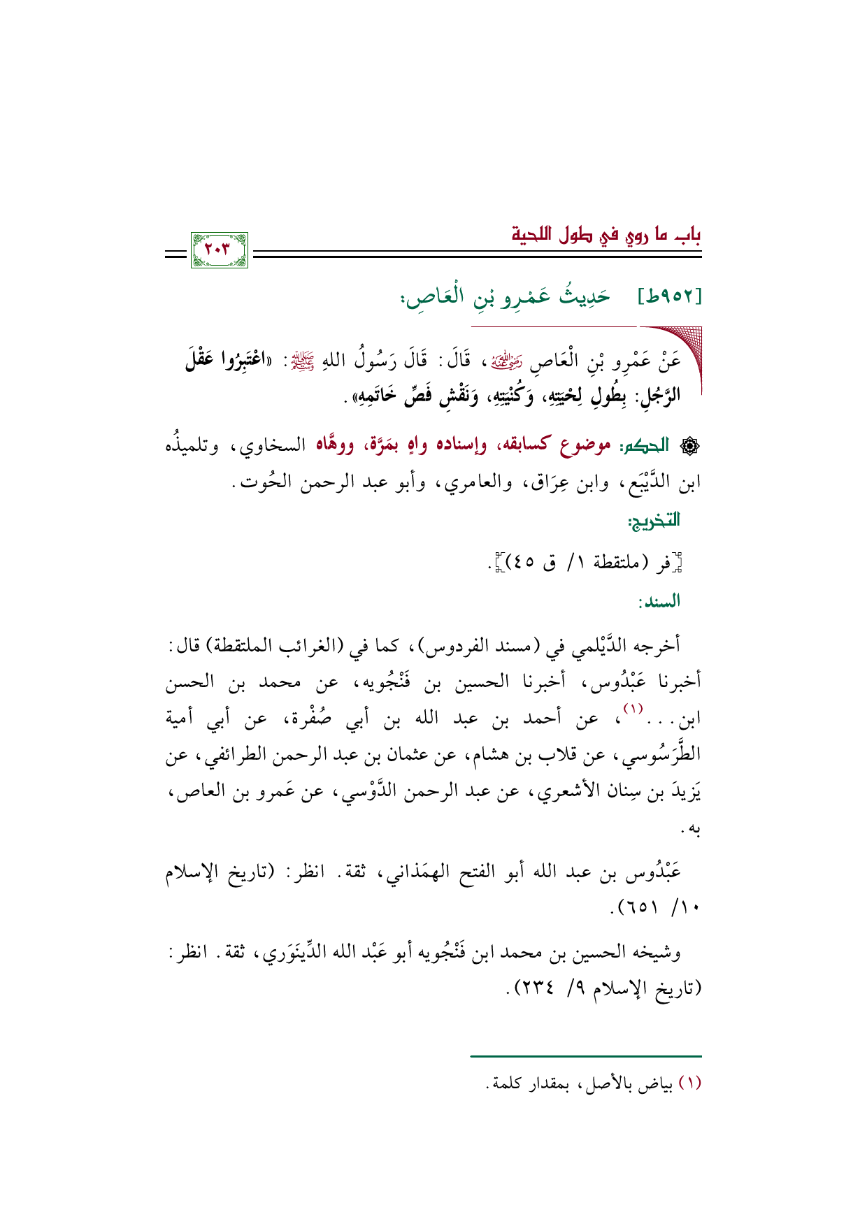 أخرجه الدَّيْلمي في "مسند الفردوس"، كما في (الغرائب الملتقطة) قال: أخبرنا عَبْدُوس، أخبرنا الحسين بن فَنْجُويه، عن محمد بن الحسن بن ... (¬١)، عن أحمد بن عبد الله بن أبي صُفْرة، عن أبي أمية الطَّرَسُوسي، عن قلاب بن هشام، عن عثمان بن عبد الرحمن الطرائفي، عن يَزيدَ بن سِنان الأشعري، عن عبد الرحمن الدَّوْسي، عن عَمرو بن العاص، به.