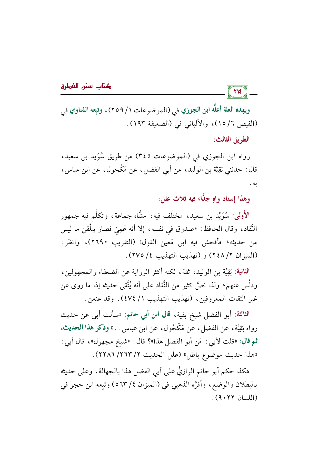 الأولى: سُوَيْد بن سعيد، مختلَف فيه، مشَّاه جماعة، وتكلَّم فيه جمهور النُّقاد، وقال الحافظ: "صدوق في نفسه، إلا أنه عَمِيَ فصار يتلَّقن ما ليس من حديثه؛ فأفحش فيه ابن مَعين القول" (التقريب ٢٦٩٠)، وانظر: (الميزان ٢/ ٢٤٨) و (تهذيب التهذيب ٤/ ٢٧٥).