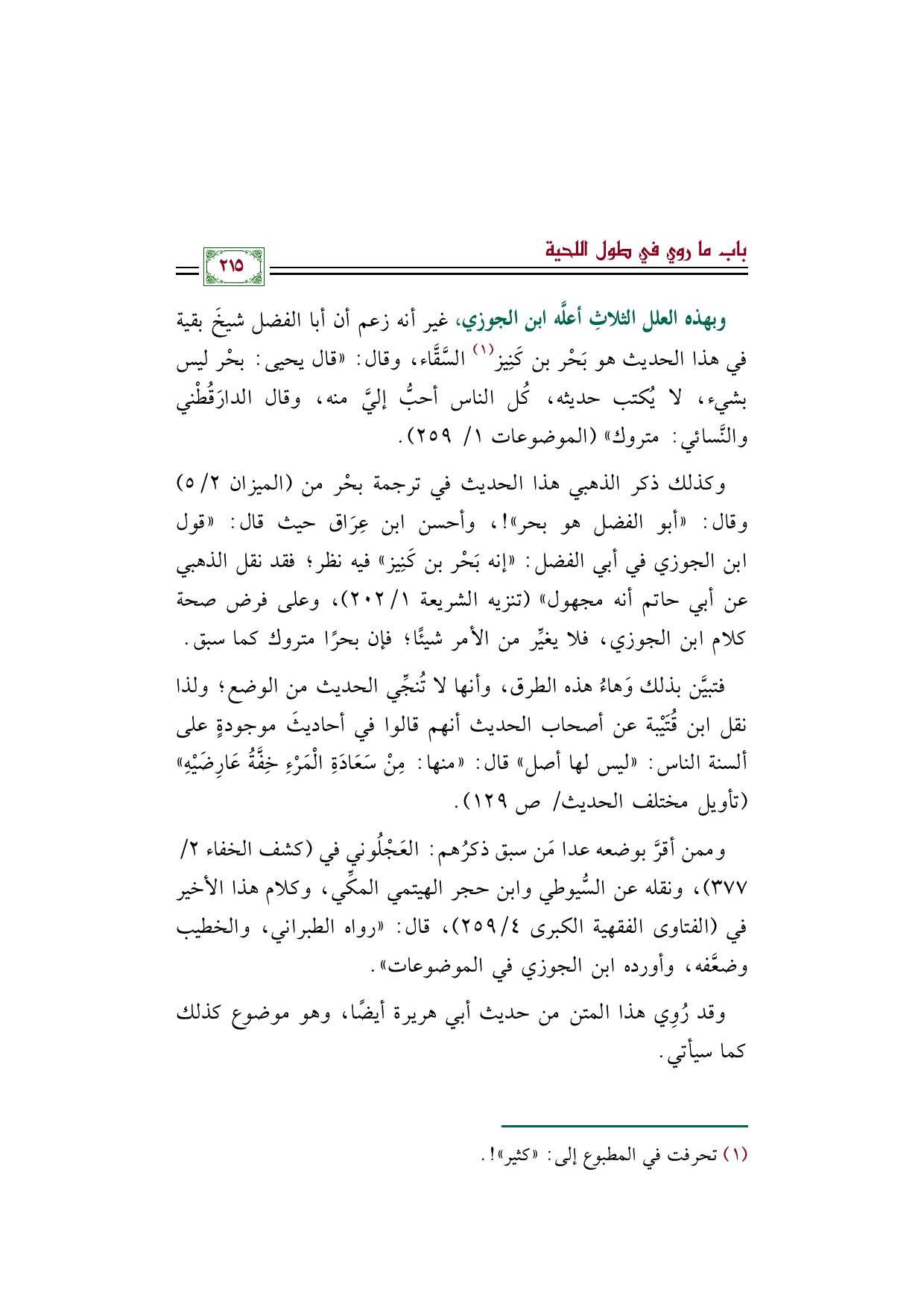 وكذلك ذكر الذهبي هذا الحديث في ترجمة بحْر من (الميزان ٢/ ٥) وقال: "أبو الفضل هو بحر"! ، وأحسن ابن عِرَاق حيث قال: "قول ابن الجوزي في أبي الفضل: "إنه بَحْر بن كَنِيز" فيه نظر؛ فقد نقل الذهبي عن أبي حاتم أنه مجهول" (تنزيه الشريعة ١/ ٢٠٢)، وعلى فرض صحة كلام ابن الجوزي، فلا يغيِّر من الأمر شيئًا؛ فإن بحرًا متروك كما سبق.
