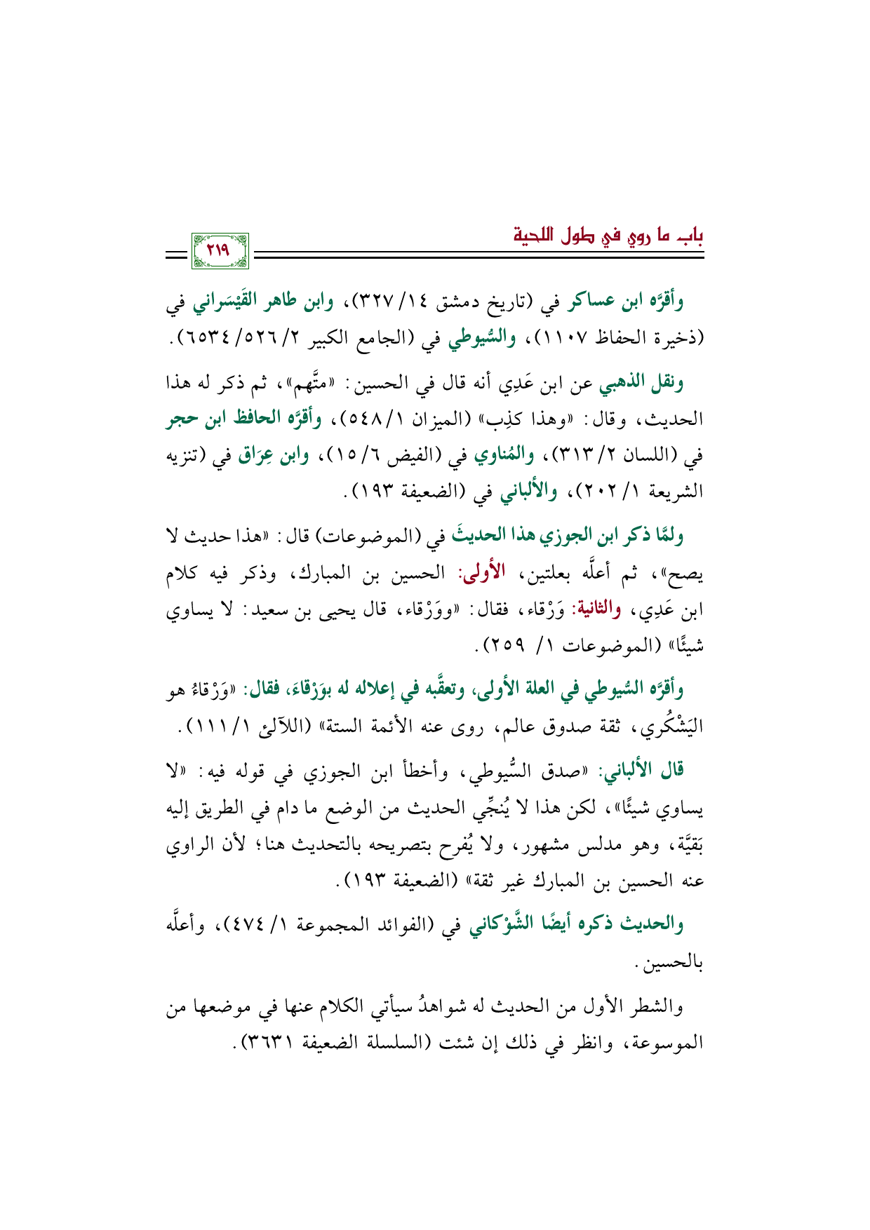 وأقرَّه السُّيوطي في العلة الأولى، وتعقَّبه في إعلاله له بوَرْقاءَ، فقال: "وَرْقاءُ هو اليَشْكُري، ثقة صدوق عالم، روى عنه الأئمة الستة" (اللآلئ ١/ ١١١).