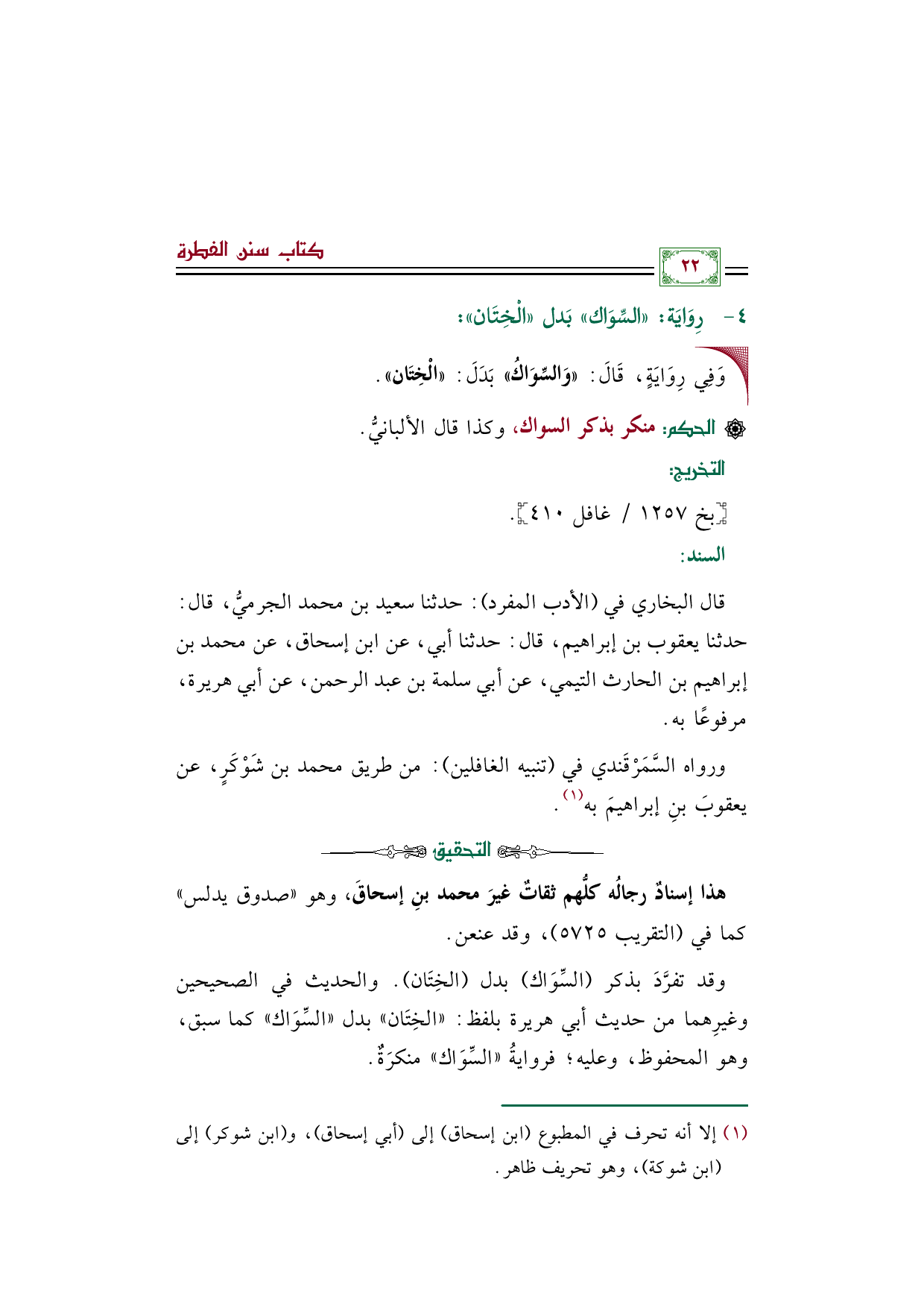 وقد تفرَّدَ بذكر (السِّوَاك) بدل (الخِتَان). والحديث في الصحيحين وغيرِهما من حديث أبي هريرة بلفظ: "الخِتَان" بدل "السِّوَاك" كما سبق، وهو المحفوظ، وعليه؛ فروايةُ "السِّوَاك" منكرَةٌ.