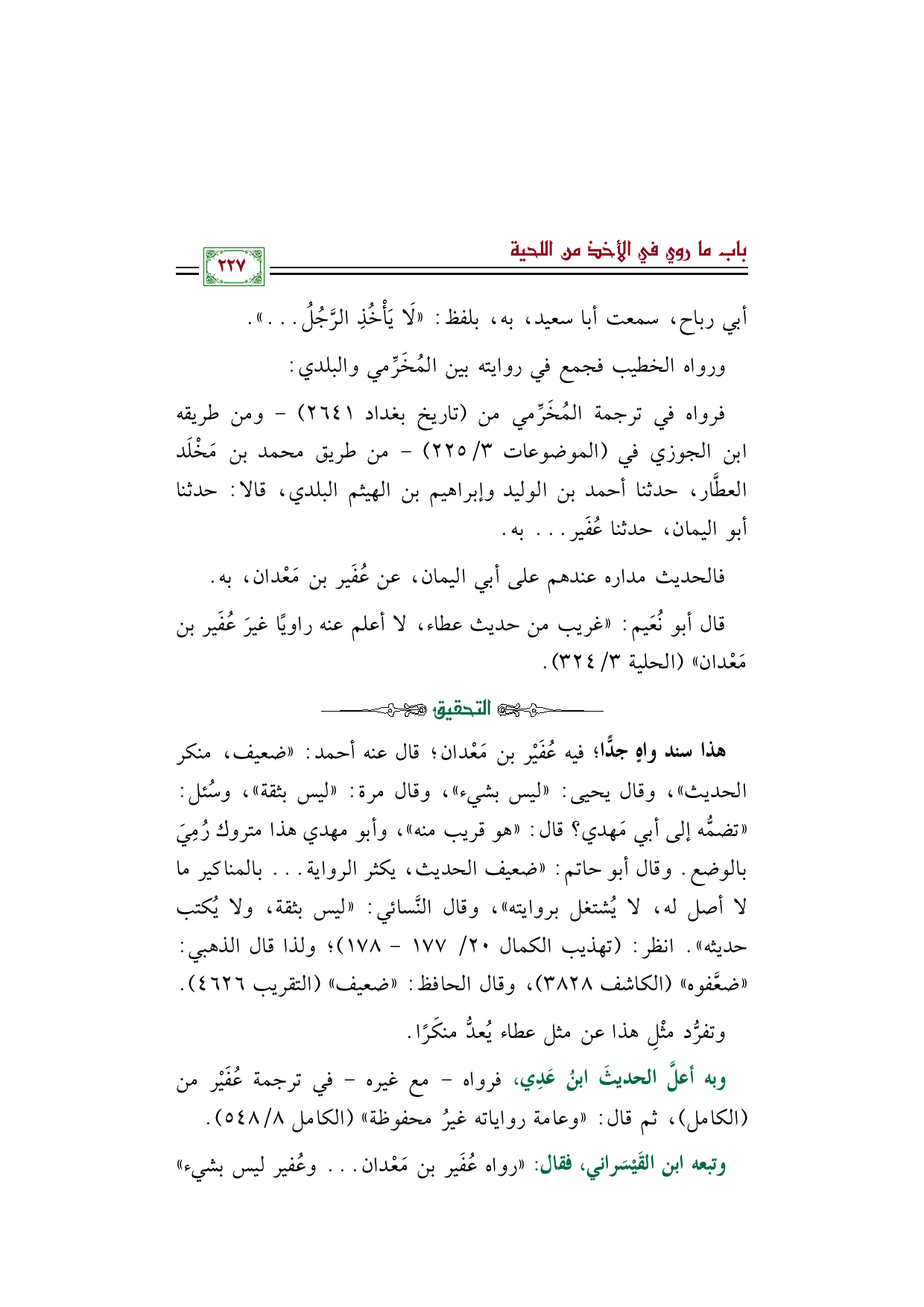 قال أبو نُعَيم: "غريب من حديث عطاء، لا أعلم عنه راويًا غيرَ عُفَير بن مَعْدان" (الحلية ٣/ ٣٢٤).