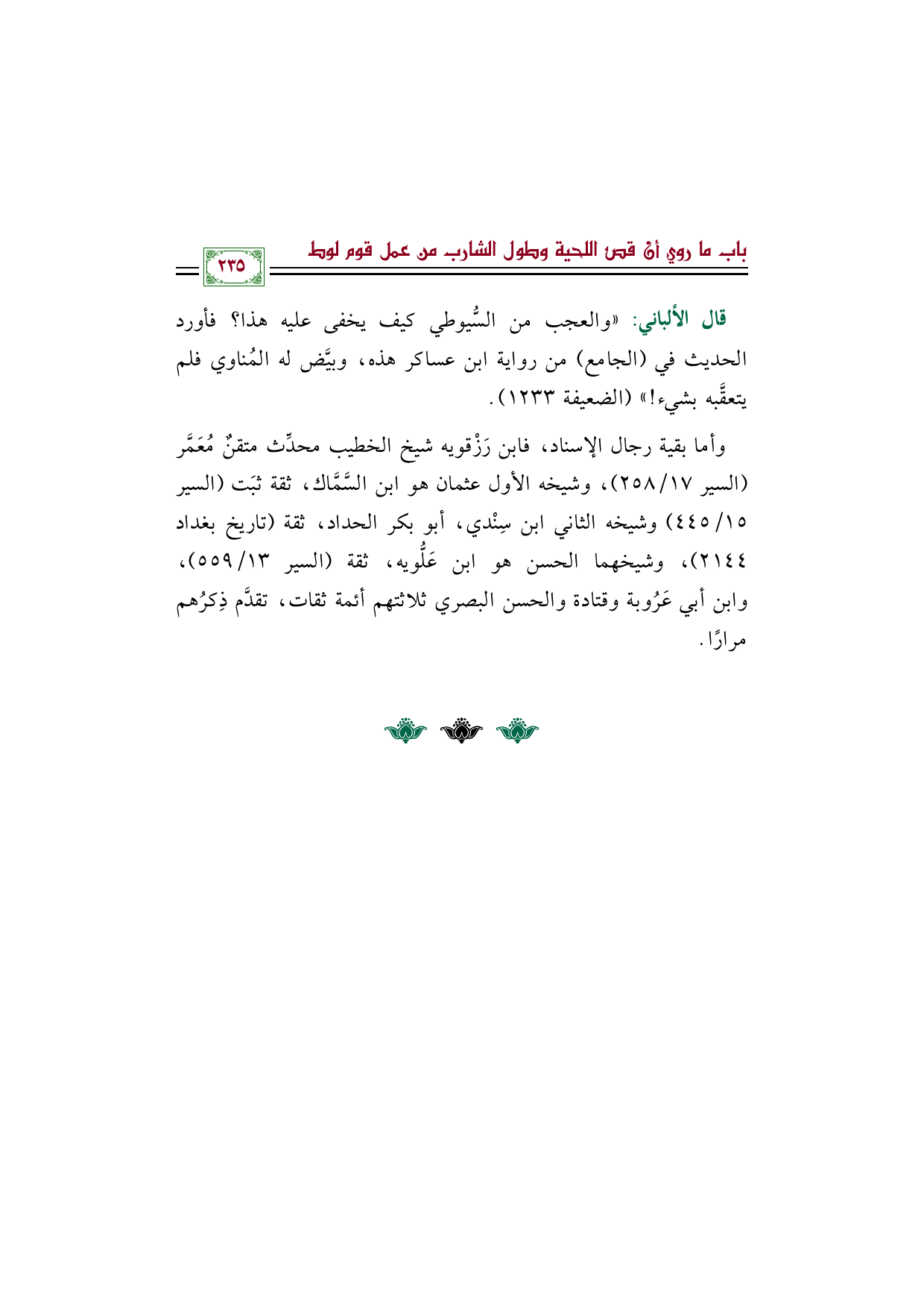 قال الألباني: "والعجب من السُّيوطي كيف يخفى عليه هذا؟ فأورد الحديث في (الجامع) من رواية ابن عساكر هذه، وبيَّض له المُناوي فلم يتعقَّبه بشيء! " (الضعيفة ١٢٣٣).