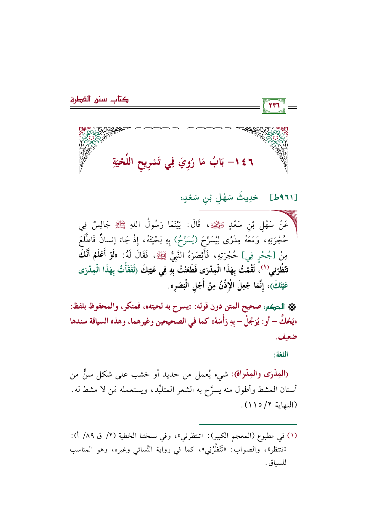 [الحكم]: صحيح المتن دون قوله: "يسرح به لحيته"، فمنكر، والمحفوظ بلفظ: "يَحُكُّ - أو: يُرَجِّلُ- بِهِ رَأْسَهُ" كما في الصحيحين وغيرهما، وهذه السياقة سندها ضعيف.
