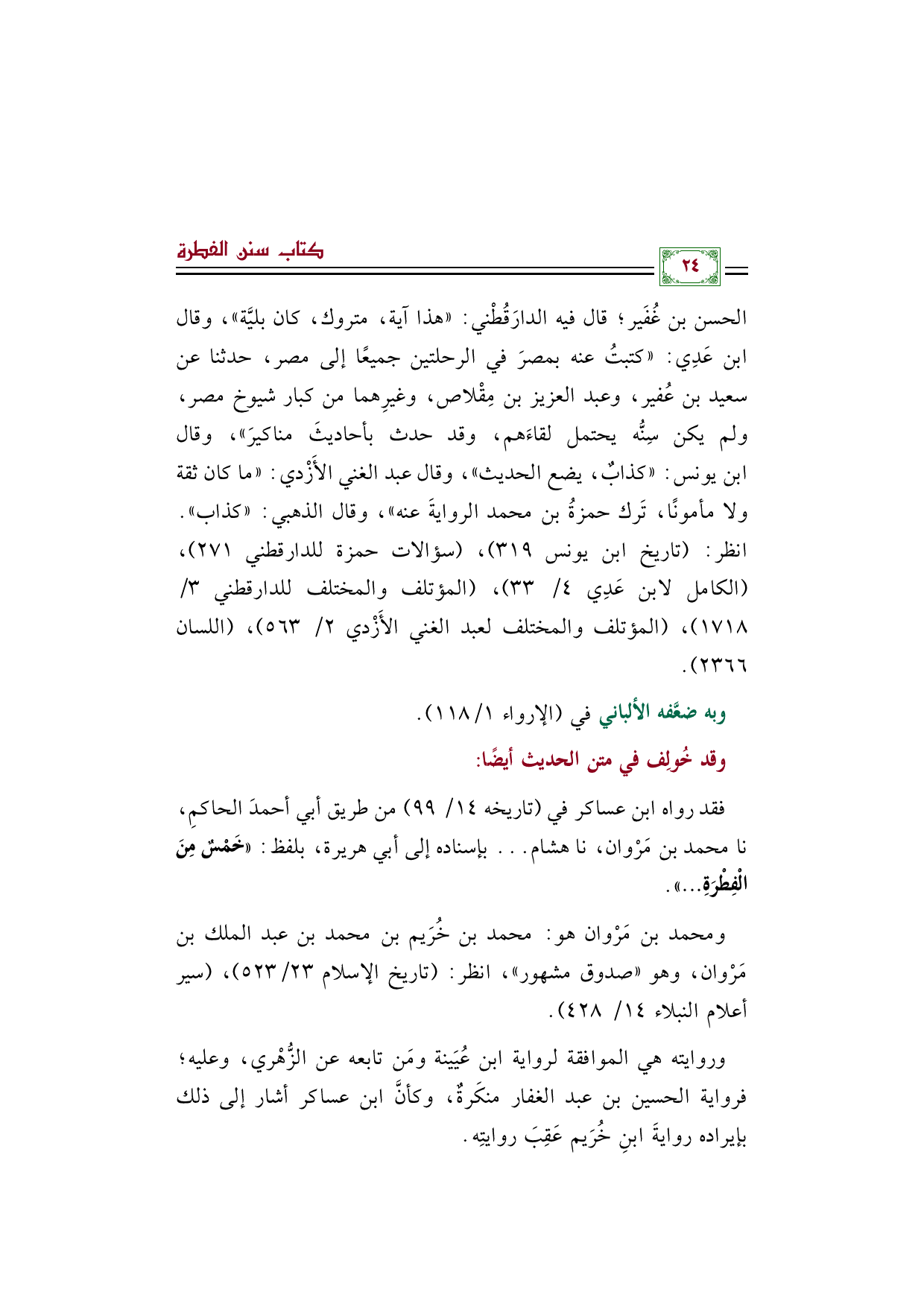 وروايته هي الموافقة لرواية ابن عُيَينة ومَن تابعه عن الزُّهْري، وعليه؛ فرواية الحسين بن عبد الغفار منكَرةٌ، وكأنَّ ابن عساكر أشار إلى ذلك بإيراده روايةَ ابنِ خُرَيم عَقِبَ روايتِه.