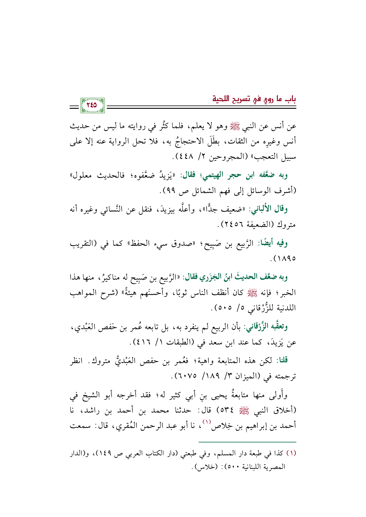 وبه ضعَّف الحديثَ ابنُ الجَزَري فقال: "الرَّبيع بن صَبِيح له مناكيرُ، منها هذا الخبر؛ فإنه صلى الله عليه وسلم كان أنظف الناس ثوبًا، وأحسنَهم هيئةً" (شرح المواهب اللدنية للزُّرْقاني ٥/ ٥٠٥).