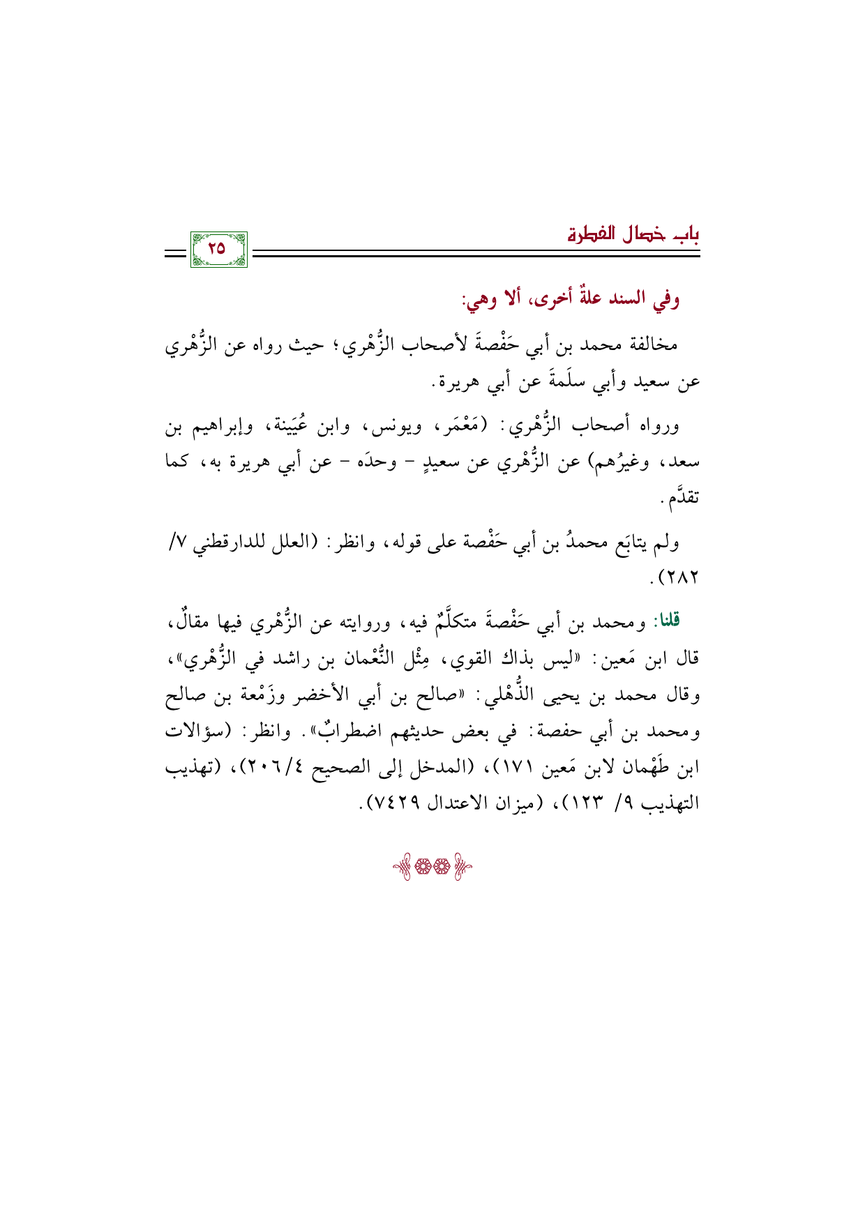 مخالفة محمد بن أبي حَفْصةَ لأصحاب الزُّهْري؛ حيث رواه عن الزُّهْري عن سعيد وأبي سلَمةَ عن أبي هريرة.