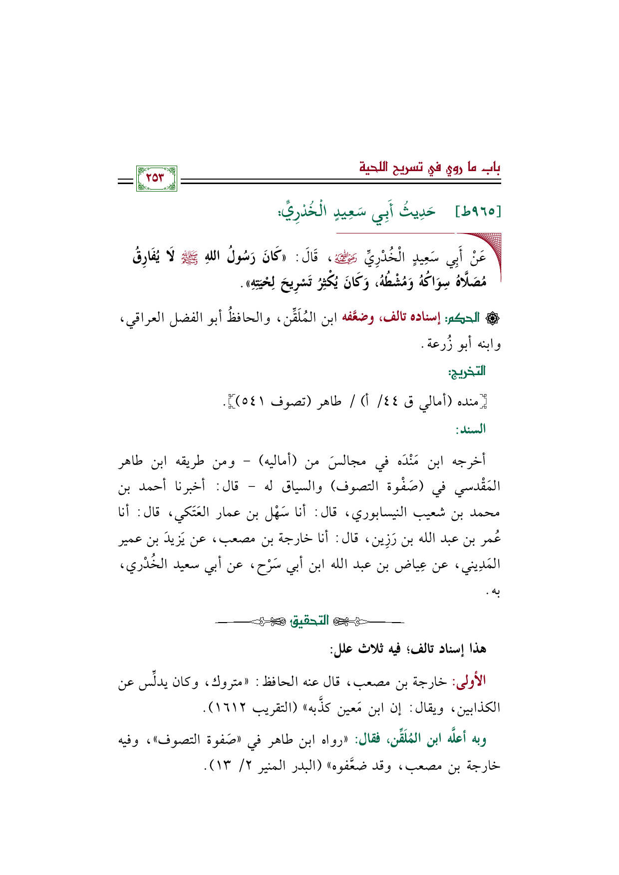 أخرجه ابن مَنْدَه في مجالسَ من "أماليه"- ومن طريقه ابن طاهر المَقْدسي في (صَفْوة التصوف) والسياق له- قال: أخبرنا أحمد بن محمد بن شعيب النيسابوري، قال: أنا سَهْل بن عمار العَتَكي، قال: أنا عُمر بن عبد الله بن رَزِين، قال: أنا خارجة بن مصعب، عن يَزيدَ بن عمير المَدِيني, عن عِياض بن عبد الله ابن أبي سَرْح، عن أبي سعيد الخُدْري، به.