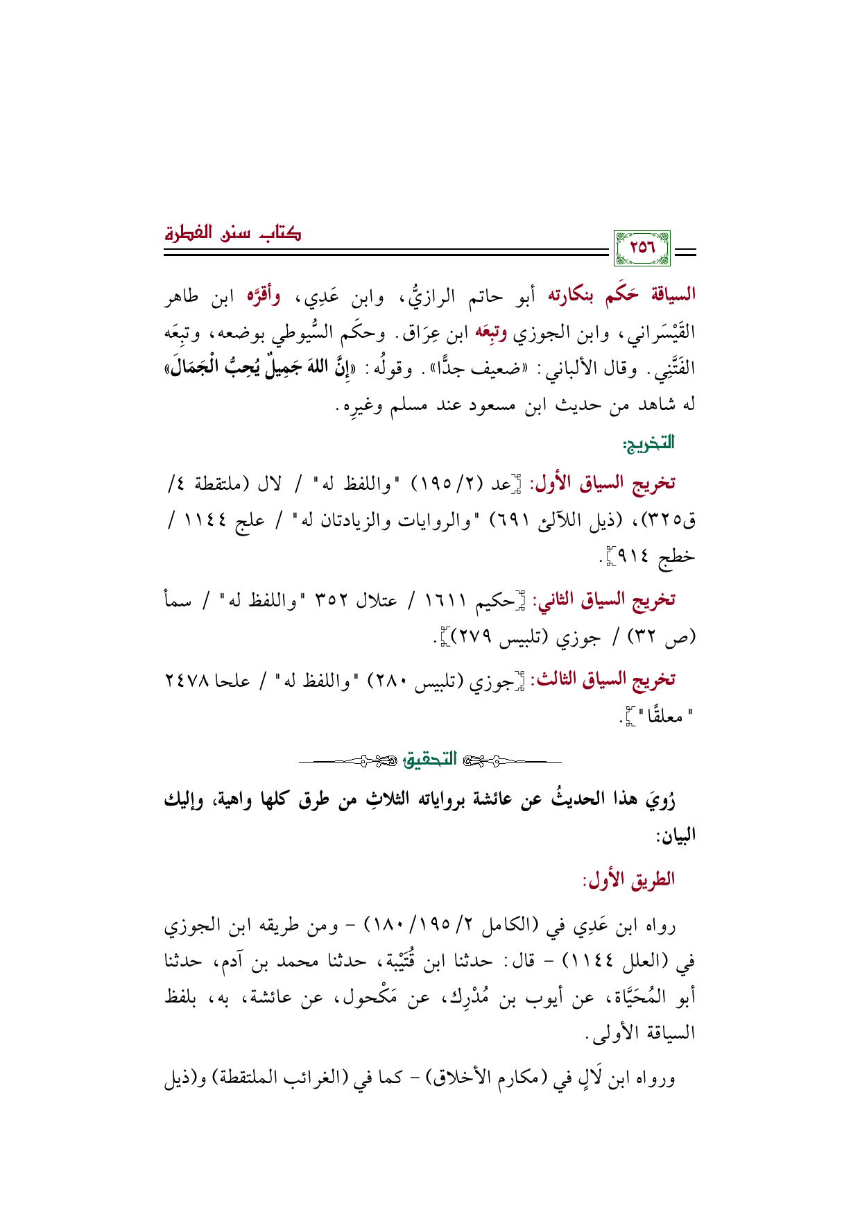 السياقة حَكَم بنكارته أبو حاتم الرازيُّ، وابن عَدِي، وأقرَّه ابن طاهر القَيْسَراني، وابن الجوزي وتبِعَه ابن عِرَاق. وحكَم السُّيوطي بوضعه، وتبِعَه الفَتَّنِي. وقال الألباني: "ضعيف جدًّا". وقولُه: "إِنَّ اللهَ جَمِيلٌ يُحِبُّ الْجَمَالَ" له شاهد من حديث ابن مسعود عند مسلم وغيرِه.
