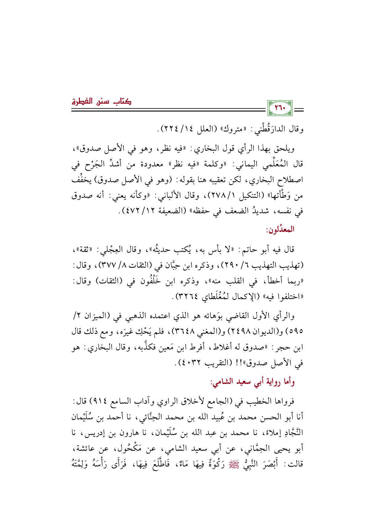 ويلحق بهذا الرأي قول البخاري: "فيه نظر، وهو في الأصل صدوق"، قال المُعَلِّمي اليماني: "وكلمة "فيه نظر" معدودة من أشدِّ الجَرْح في اصطلاح البخاري، لكن تعقيبه هنا بقوله: (وهو في الأصل صدوق) يخفِّف من وَطْأتها" (التنكيل ١/ ٢٧٨)، وقال الألباني: "وكأنه يعني: أنه صدوق في نفسه، شديدُ الضعف في حفظه" (الضعيفة ١٢/ ٤٧٢).