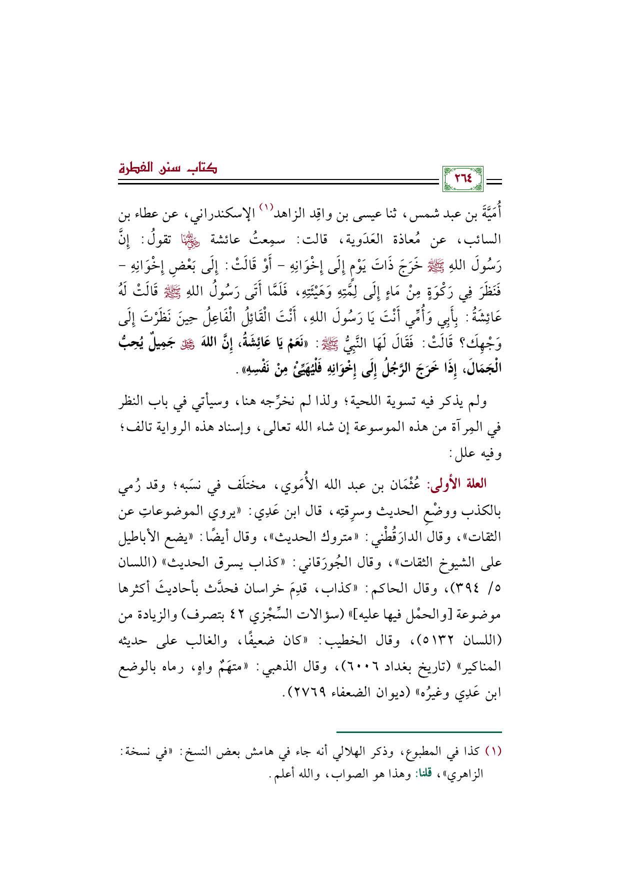 أُمَيَّةَ بن عبد شمس، ثنا عيسى بن واقِد الزاهد (¬١) الإسكندراني، عن عطاء بن السائب، عن مُعاذة العَدَوية، قالت: سمِعتُ عائشة رضي الله عنها تقولُ: إِنَّ رَسُولَ اللهِ صَلَّى اللهُ عَلَيْهِ وَسَلَّمَ خَرَجَ ذَاتَ يَوْمٍ إِلَى إِخْوَانِهِ- أَوْ قَالَتْ: إِلَى بَعْضِ إِخْوَانِهِ- فَنَظَرَ فِي رَكْوَةٍ مِنْ مَاءٍ إِلَى لِمَّتِهِ وَهَيْئَتِهِ، فَلَمَّا أَتَى رَسُولُ اللهِ صَلَّى اللهُ عَلَيْهِ وَسَلَّمَ قَالَتْ لَهُ عَائِشَةُ: بِأَبِي وَأُمِّي أَنْتَ يَا رَسُولَ اللهِ، أَنْتَ الْقَائِلُ الْفَاعِلُ حِينَ نَظَرْتَ إِلَى وَجْهِكَ؟ قَالَتْ: فَقَالَ لَهَا النَّبِيُّ صَلَّى اللهُ عَلَيْهِ وَسَلَّمَ: ((نَعَمْ يَا عَائِشَةُ، إِنَّ اللهَ عَزَّ وَجَلَّ جَمِيلٌ يُحِبُّ الْجَمَالَ، إِذَا خَرَجَ الرَّجُلُ إِلَى إِخْوَانِهِ فَلْيُهَيِّئْ مِنْ نَفْسِهِ)).