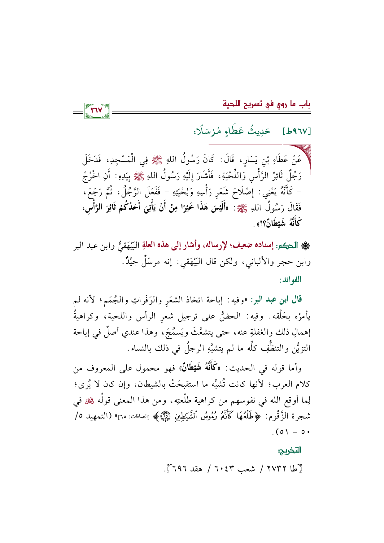 قال ابن عبد البر: "وفيه: إباحة اتخاذ الشعَرِ والوَفَراتِ والجُمَم؛ لأنه لم يأمرْه بحَلْقه. وفيه: الحضُّ على ترجيل شعرِ الرأس واللحية، وكراهيةُ إهمالِ ذلك والغفلةِ عنه، حتى يتشعَّثَ ويَسمُجَ، وهذا عندي أصلٌ في إباحة التزيُّن والتنظُّفِ كلِّه ما لم يتشبَّهِ الرجلُ في ذلك بالنساء.