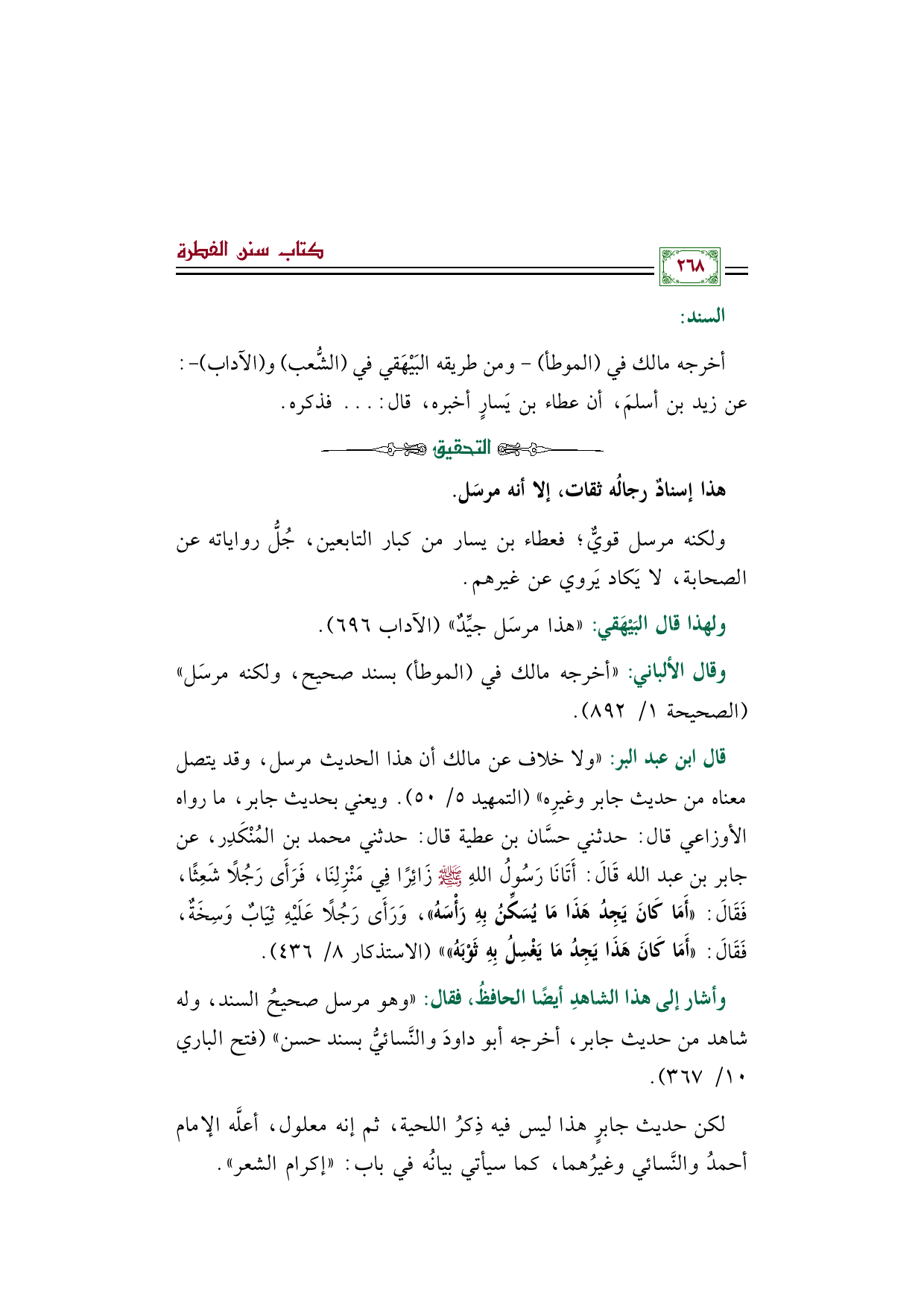 وأشار إلى هذا الشاهدِ أيضًا الحافظُ، فقال: "وهو مرسل صحيحُ السند، وله شاهد من حديث جابر، أخرجه أبو داودَ والنَّسائيُّ بسند حسن" (فتح الباري ١٠/ ٣٦٧).