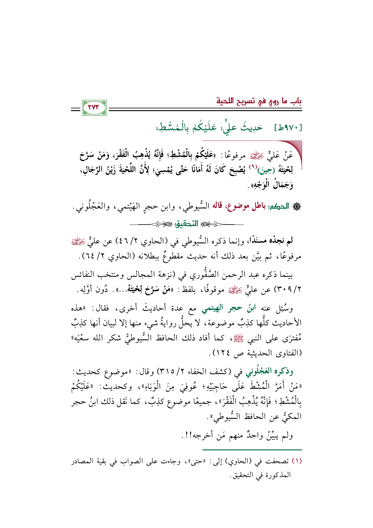 بينما ذكره عبد الرحمن الصَّفُّوري في (نزهة المجالس ومنتخب النفائس ٢/ ٣٠٩) عن عليٍّ رضي الله عنه موقوفًا، بلفظ: "مَنْ سَرَّحَ لِحْيَتَهُ ... ". دُون أوَّلِه.