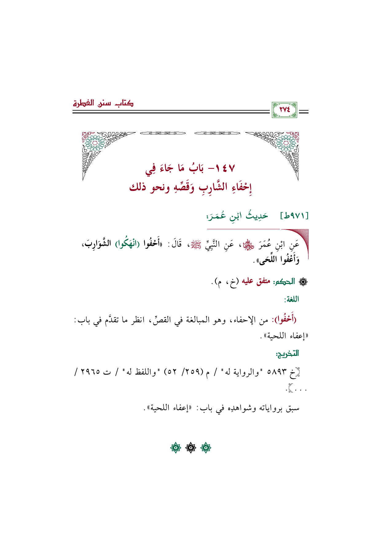◼ عَنِ ابْنِ عُمَرَ رَضِيَ اللهُ عَنْهُمَا، عَنِ النَّبِيِّ صَلَّى اللهُ عَلَيْهِ وَسَلَّمَ، قَالَ: ((أَحْفُوا (انْهَكُوا) الشَّوَارِبَ، وَأَعْفُوا اللِّحَى)).