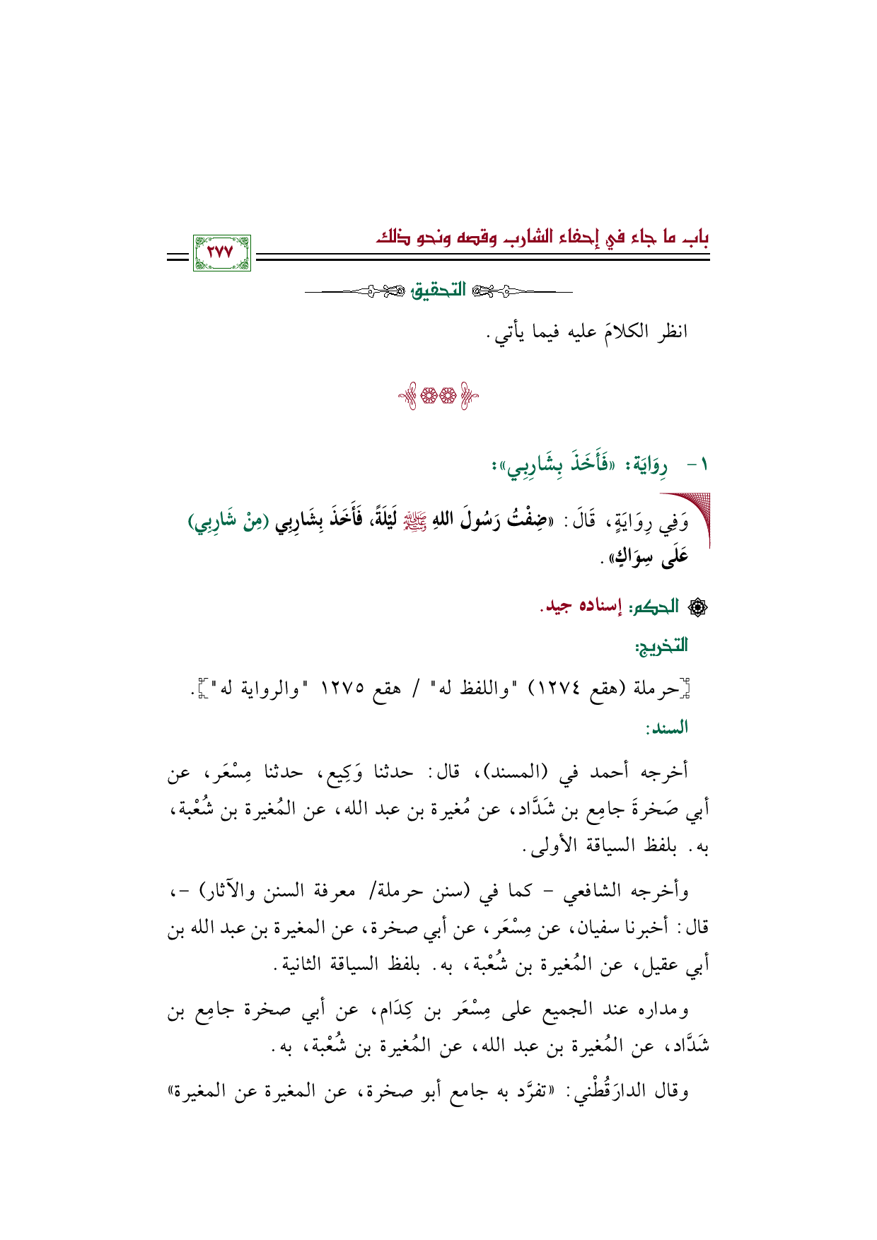 وأخرجه الشافعي- كما في (سنن حرملة/ معرفة السنن والآثار) -، قال: أخبرنا سفيان، عن مِسْعَر، عن أبي صخرة، عن المغيرة بن عبد الله بن أبي عقيل، عن المُغيرة بن شُعْبة، به. بلفظ السياقة الثانية.
