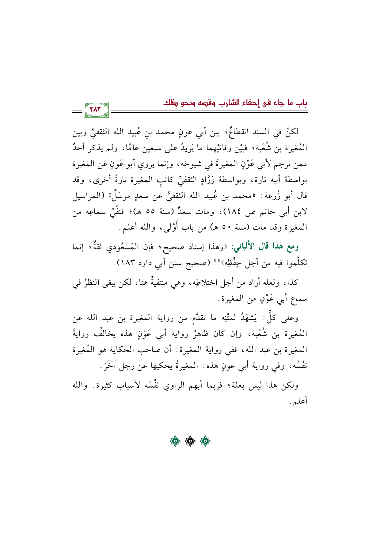 لكنْ في السند انقطاعٌ؛ بين أبي عونٍ محمد بنِ عُبيد الله الثقفيِّ وبين المُغيرة بن شُعْبة؛ فبيْن وفاتيْهما ما يَزيدُ على سبعين عامًا، ولم يذكر أحدٌ ممن ترجم لأبي عَوْنٍ المغيرةَ في شيوخه، وإنما يروي أبو عَونٍ عن المغيرة بواسطة أبيه تارة، وبواسطة وَرَّادٍ الثقفيِّ كاتبِ المغيرة تارةً أخرى، وقد قال أبو زُرعة: "محمد بن عُبيد الله الثقفيُّ عن سعدٍ مرسَلٌ" (المراسيل لابن أبي حاتم ص ١٨٤)، ومات سعدٌ (سنة ٥٥ هـ)؛ فنفْيُ سماعِه من المغيرة وقد مات (سنة ٥٠ هـ) من باب أَوْلى، والله أعلم.