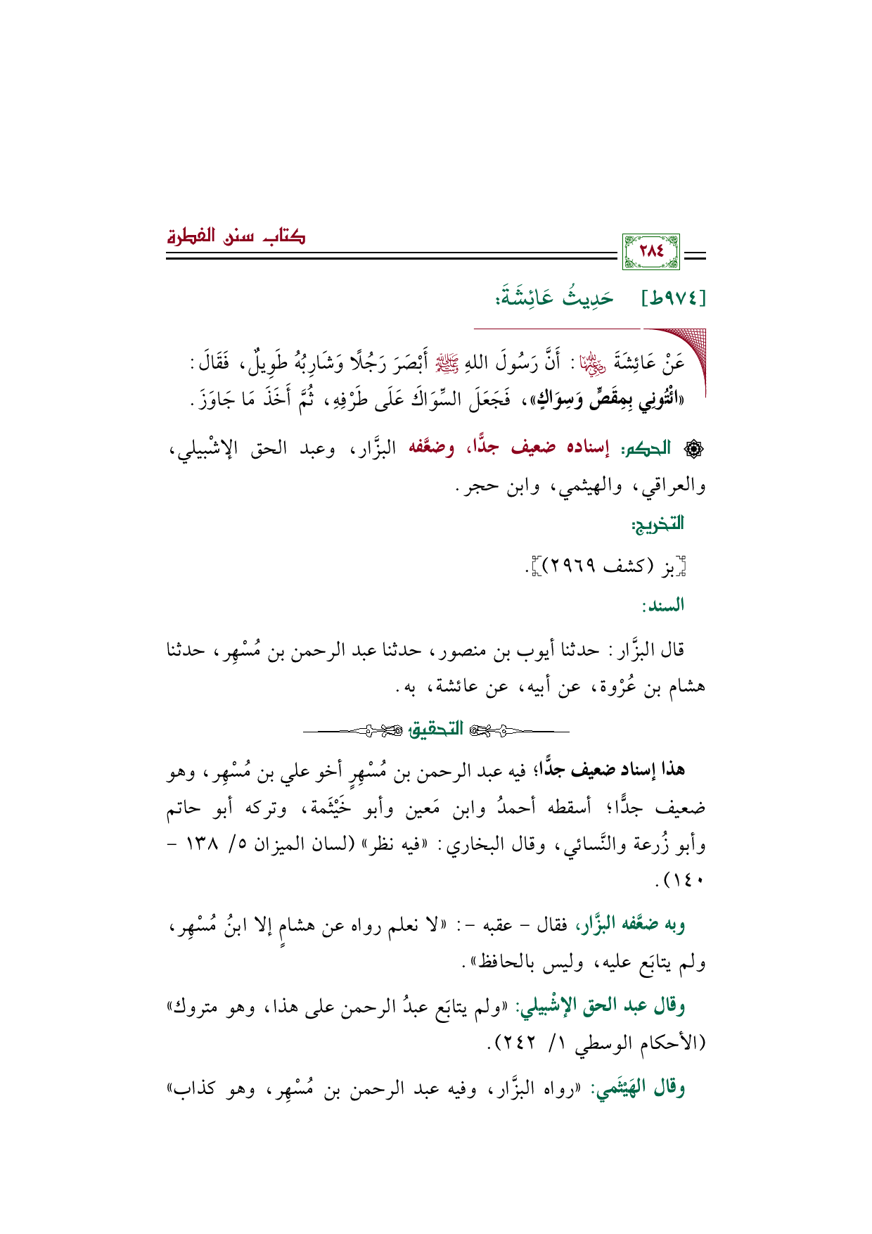 قال البزَّار: حدثنا أيوب بن منصور، حدثنا عبد الرحمن بن مُسْهِر، حدثنا هشام بن عُرْوة، عن أبيه، عن عائشة، به.