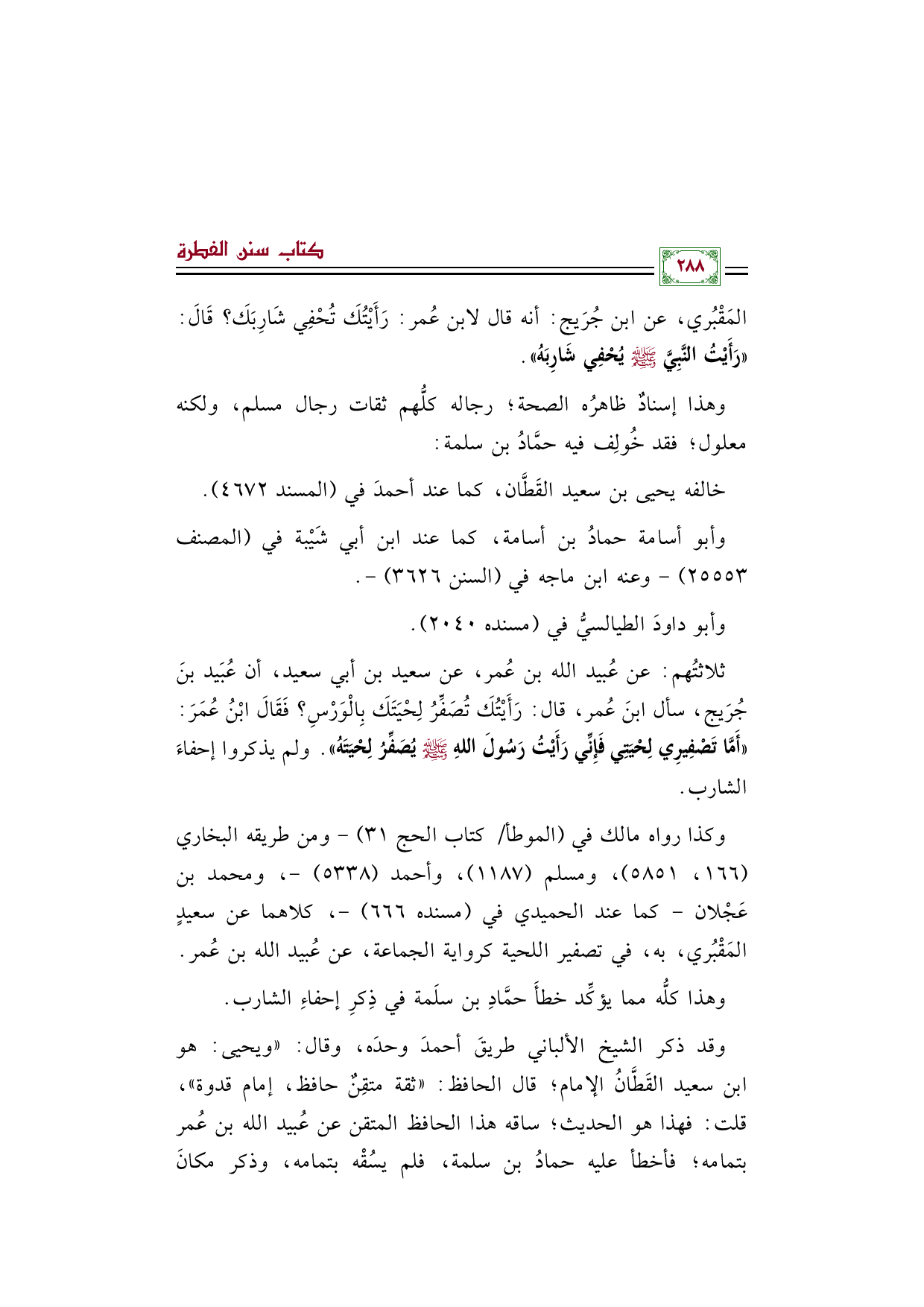 وهذا كلُّه مما يؤكِّد خطأَ حمَّادِ بن سلَمة في ذِكرِ إحفاءِ الشارب.