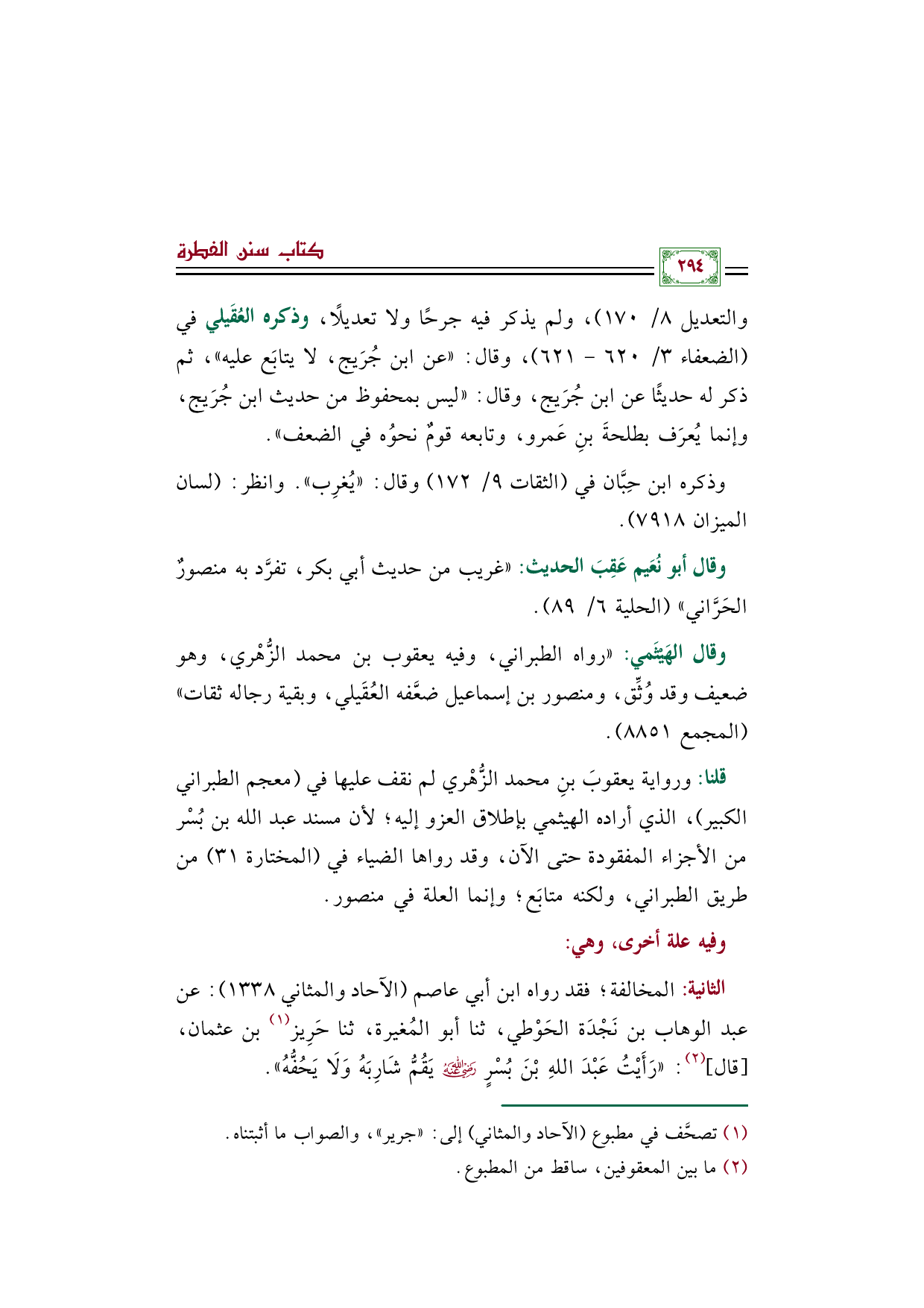 قلنا: ورواية يعقوبَ بنِ محمد الزُّهْري لم نقف عليها في معجم الطبراني الكبير، الذي أراده الهيثمي بإطلاق العزو إليه؛ لأن مسند عبد الله بن بُسْر من الأجزاء المفقودة حتى الآن، وقد رواها الضياء في (المختارة ٣١) من طريق الطبراني، ولكنه متابَع؛ وإنما العلة في منصور.