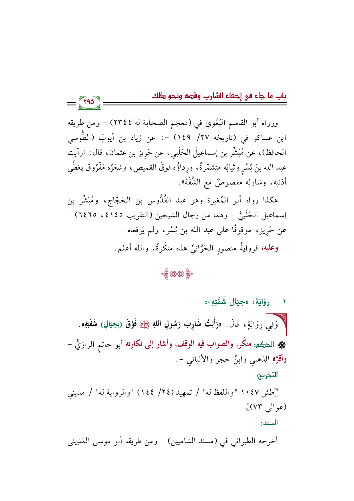 ورواه أبو القاسم البَغَوي في (معجم الصحابة له ٢٣٤٤) - ومن طريقه ابن عساكر في (تاريخه ٢٧/ ١٤٩) -: عن زياد بن أيوبَ (الطُّوسي الحافظ)، عن مُبَشِّر بن إسماعيلَ الحَلَبي، عن حَرِيز بن عثمان، قال: ((رأيت عبد الله بنَ بُسْرٍ وثيابُه متشمّرةٌ، ورِداؤُه فوقَ القميص، وشعَرُه مَفْرُوق يغطِّي أذنيه، وشاربُه مقصوصٌ مع الشَّفَة)).