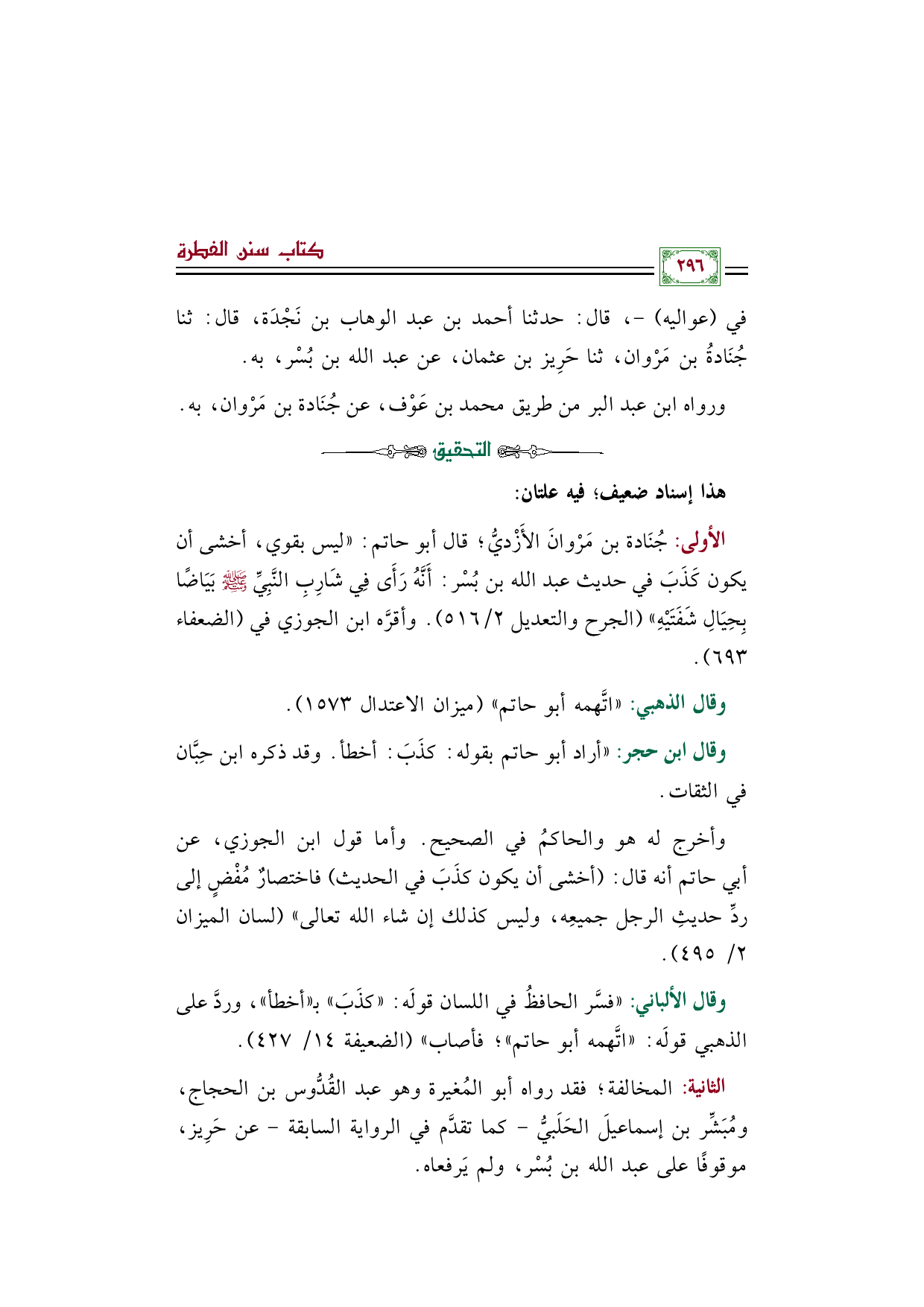 الأولى: جُنَادة بن مَرْوانَ الأَزْديُّ؛ قال أبو حاتم: "ليس بقوي، أخشى أن يكون كَذَبَ في حديث عبد الله بن بُسْر: أَنَّهُ رَأَى فِي شَارِبِ النَّبِيِّ صَلَّى اللهُ عَلَيْهِ وَسَلَّمَ بَيَاضًا بِحِيَالِ شَفَتَيْهِ" (الجرح والتعديل ٢/ ٥١٦). وأقرَّه ابن الجوزي في (الضعفاء ٦٩٣).