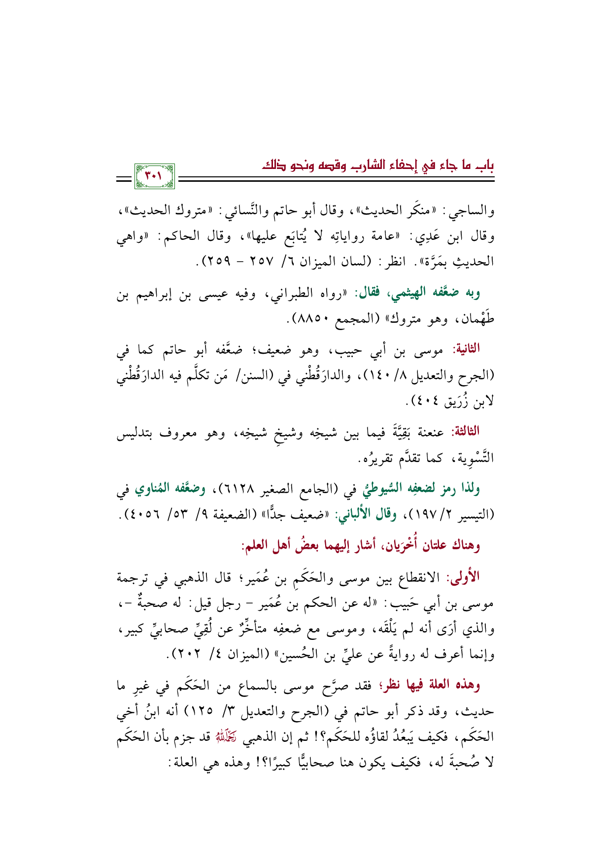وهذه العلة فيها نظر؛ فقد صرَّح موسى بالسماع من الحَكَم في غيرِ ما حديث، وقد ذكر أبو حاتم في (الجرح والتعديل ٣/ ١٢٥) أنه ابنُ أخي الحَكَم، فكيف يَبعُدُ لقاؤُه للحَكَم؟ ! ثم إن الذهبي رحمه الله قد جزم بأن الحَكَم لا صُحبةَ له، فكيف يكون هنا صحابيًّا كبيرًا؟ ! وهذه هي العلة: