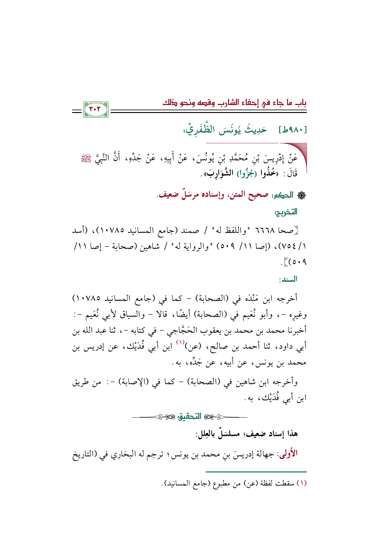 أخرجه ابن مَنْدَه في "الصحابة"- كما في (جامع المسانيد ١٠٧٨٥) وغيرِه-، وأبو نُعَيم في "الصحابة" أيضًا، قالا- والسياق لأبي نُعَيم-: أخبرنا محمد بن محمد بن يعقوب الحَجَّاجي- في كتابه-، ثنا عبد الله بن أبي داود، ثنا أحمد بن صالح، (عن) (¬١) ابن أبي فُدَيْك، عن إدريس بن محمد بن يونس، عن أبيه، عن جَدِّه، به.